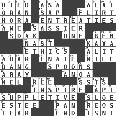 ACROSS 1. Passed on 5. White ___ sheet 8. Mountain range southwest of Kyrgyzstan 12. NW Algerian seaport 13. Plant excrement 14. Seductive woman who exploits men 15. Israeli folk dance 16. Pleas 19. One (Scot) 20. More lively and spirited 21. Neighbor of Neb. 23. Single 24. Benjamin's nick name 27. Political cartoonist Thomas 30. Polynesian shrub of the pepper family 31. Value system 34. Set down 35. The sixth month of the Jewish calendar 38. Related on the mother's side 40. Mediterranean tributary 41. Mild oath, euphamism for damn 42. Soup utensils 44. Like ___ of sunshine 45. Small Philippine buffalo 46. Cartoonist voice _ Blanc 47. Portuguese money of account (variant) 50. Fast planes 53. Heighten or intensify 57. Fitting 59. Supplementary 63. A type of plum 64. First name in cosmetics 65. Baking dish 66. Vintage cars 67. Pull into pieces 68. Conclusion 69. Is not DOWN 1. Capital of the state of Qatar 2. Removes the wrinkles 3. Having ears or earlike features 4. Heredity factor (abbr.) 5. Toward the sea 6. Without 7. Tenement units (abbr.) 8. Keyboard modifier key 9. Cards in a Roman deck? 10. "We ___ not amused" (Victoria) 11. ___ a Wonderful Life 14. Conductor's collection 17. _ de Janeiro 18. Car or cant ending 20. Three-handed card game 22. Disorder of the immune system 24. Indonesian resort city 25. Morally bad or wrong 26. Nathan's nickname 28. A female animal or person 29. Metal containers 30. Sunflower state 32. Head covering 33. Portico 35. First man 36. Have the gumption 37. Of or related to the anus 39. A really long time 43. Olfactory organ 47. Cause heat under the collar 48. Compass dir. 49. Eastern Standard Time (abbr.) 51. Lies 52. Soup utensil 54. Corncob 55. _ the terrible 56. Tear apart 58. Trial 59. Arrange properly for use 60. Purpose 61. Parent Teacher Association (abbr.) 62. For each 63. Indian title of respect (Mr.)