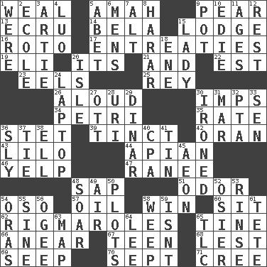 ACROSS 1. Welt 5. Nursemaid 9. Lightbulb-shaped fruit 13. Shade of tan 14. Actor Lugosi 15. Inn 16. Printing process, for short 17. Pleas 19. Biblical high priest 20. It is 21. Plus 22. Eastern Standard Time (abbr.) 23. Snakelike fish 25. Marina Del _, California 26. Verbally 30. Naughty children 34. _ dish (used to culture cells) 35. Pace 36. Proofreading order 39. Tinged 42. Northwest Algerian city 43. _ and Stitch 44. Bee-related 46. Sharp bark 47. The wife of a rajah (variant) 48. Plant excrement 51. Scent 54. Bear (Spanish) 57. Lubricate 58. Victory 60. Be seated 62. Frustrating wastes of time 65. Prong on a fork 66. Approach 67. Adolescent 68. For fear that 69. Ooze 70. Back-to-school mo. 71. Algonquian DOWN 1. We are 2. Learning spot: Fr. 3. Nick name for Arthur 4. Nilotic language 5. Collude with 6. Not women's 7. The first octave above the treble staff 8. Ethiopian city, capital of Harari 9. Cooking vessel 10. Singer Brickell 11. Grows older 12. Respite 15. Kenny Rogers chart-topper in '80 18. Compass dir. 20. Capri or Wight 24. Portable computer 27. Baseball player Mel 28. RI univ. 29. Middle Eastern gold or silver currency 30. Pressed 31. Spoil 32. Parent Teacher Association (abbr.) 33. Elected rep. 36. Insidious 37. Neckwear 38. Pipe bend 40. Numbers guy (abbr.) 41. Shallow baking pan 45. A really long time 48. Fly high 49. Wind 50. Schemes 52. Flexible twig of a willow tree 53. Remove soap 54. Mouths or openings 55. Trig term 56. Double curve, resembling the letter S 58. Shed a tear 59. Is not 61. Wig 63. Atlas unit 64. Area sheltered from the wind 65. Affectionate concern, for short