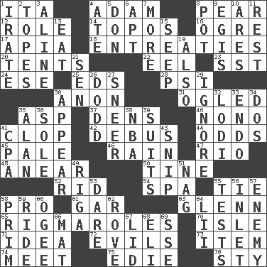 ACROSS 1. Call ___ day 4. First man 8. Lightbulb-shaped fruit 12. Hero or heavy, e.g. 14. Literary convention 16. Legendary monster 17. Capital of Western Samoa 18. Pleas 20. Portable shelters 22. Snakelike fish 23. Fast jet (abbr.) 24. Compass dir. 25. Begley and Asner 28. 23rd letter of the Greek alphabet 30. Soon (poet.) 31. Stared at amorously 35. Viper 37. Lairs 40. Words to Nanette 41. Hoof sound 42. Alight from a bus 44. Probability 45. Light colored 46. Precipitation 47. River (Sp.) 48. Approach 50. Prong on a fork 52. To free from 54. Health resort 55. Make a knot 58. Adept person 61. Slender fish 63. American astronaut and politician John 65. Frustrating wastes of time 70. Small island 71. The content of cognition 72. Vices 73. A whole individual unit 74. Rendezvous 75. Singer Brickell 76. Filthy place DOWN 1. Feeling or showing extreme anger 2. Drinks excessively 3. Place in a line 4. Had dinner 5. Spanish title 6. Fitting 7. Greater amount 8. Cooking vessel 9. The front part of a cuirass 10. Ancient Greek god of war 11. State of inaction 13. Consume 15. Ooze 19. In addition 21. Elected rep. 26. Texas town _ City 27. Contemptuous expression 29. Snub 30. Become visible 32. Farming town in central California 33. Inside; within (prefix) 34. Two (Sp.) 35. Actor Alda or Thicke 36. Flatfish 38. Basketball assoc. 39. Sets or collections 41. Numbers guy (abbr.) 43. Clip 49. Capital of Latvia 51. Tired old horse 53. Have the gumption 55. Trials 56. An arm off of a larger body of water 57. Foe 58. Demure 59. Travel on an animal 60. Double curve, resembling the letter S 62. Be footloose 64. Cards in a Roman deck? 66. Floor protector 67. Flaplike covering 68. Biblical high priest 69. Compass dir.
