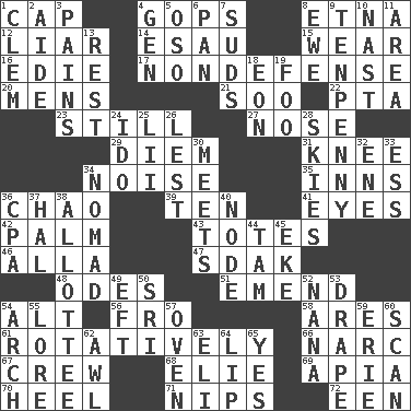 ACROSS 1. Head covering 4. Republicans 8. Inactive volcano in Sicily 12. One who doesn't tell the truth 14. Son of Isaac 15. Put on (as clothing) 16. Singer Brickell 17. Unrelated to defense, as in spending 20. Not women's 21. "Barney Miller" actor Jack 22. Parent Teacher Association (abbr.) 23. Not moving 27. Sense of smell 29. South Vietnam president (1954) 31. Leg joint 34. Annoying sound 35. Taverns 36. US Secretary of Labor Elaine L. _ 39. "___ Little Indians" 41. Snake ____ (dice throw) 42. Inside of hand 43. Hauls 46. Silent film actress Nazimova 47. Neighbor of Neb. 48. Lyric poems 51. Make improvements or corrections to 54. Keyboard modifier key 56. Away 58. Ancient Greek god of war 61. Producing rotation 66. Drug cop 67. Group working together 68. Writer Wiesel 69. Capital of Western Samoa 70. Person who is morally reprehensible 71. Pinches, bites 72. Car or cant ending DOWN 1. Clement's nick name 2. Helper 3. Aches 4. Commissioned military rank (abbr.) 5. Bear (Spanish) 6. Baking dish 7. Beer foam 8. She-sheep 9. 3-inch nail 10. Political cartoonist Thomas 11. Length times width 13. Relief 18. Period of immesurable duration 19. Egg _ yung 24. Wedding promise 25. Cards in a Roman deck? 26. For fear that 28. Atmospheres 30. Confronts 32. Compass dir. 33. Curvy letter 34. Wanderer 36. Numbers guy (abbr.) 37. Actor Linden 38. One to whom something is allotted 40. Thickened enlargement 44. Scottish cap 45. Supplement with great effort 49. Lizard (obsolete) 50. Indian title of respect (Mr.) 52. Nanny 53. Window treatment 54. Bowlike part 55. Old wives' tales, e.g. 57. Baking chamber 59. 4th largest of the Great Lakes 60. Skim 62. Leather borer 63. Connecticut Ivy Leaguer 64. Mouth edge 65. Consenting reply