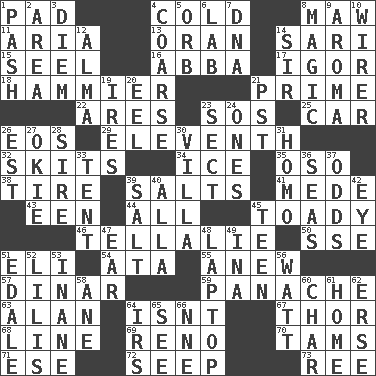 ACROSS 1. Writing tablet 4. Chilled 8. Opening into something insatiable 11. Operatic vocal solo 13. NW Algerian seaport 14. Indian skirt 15. Sew up the eyelids of hawks and falcons 16. Swedish rock group 17. Russian composer Stravinsky 18. More overdramatic by comparison 21. First class 22. Ancient Greek god of war 23. Mayday 25. 4-wheeled motor vehicle 26. Greek goddess of the dawn 29. Veterans Day date 32. Burlesque acts 34. Frozen water 35. Bear (Spanish) 38. Become fatigued 39. Table seasonings 41. Ancient Persian 43. Car or cant ending 44. 100% 45. Sycophant 46. Copy Pinocchio 50. Compass dir. 51. Connecticut Ivy Leaguer 54. _ moment's notice (2 wds.) 55. Afresh 57. Middle Eastern gold or silver currency 59. Flamboyance 63. Actor Alda or Thicke 64. Is not 67. Son of Odin 68. Actor's bit 69. Former U.S. Attorney General Janet 70. Scottish caps 71. Compass dir. 72. Ooze 73. To sift DOWN 1. Romantic infatuation 2. Type of rug 3. South Vietnam president (1954) 4. Unrefined 5. Globe 6. Experiment locale 7. Heredity factor (abbr.) 8. Mysterious quality of enchantment 9. Scent 10. One who wires 12. _ mater 14. Title for a knight 19. Angers 20. Snakelike fish 21. Pacific Standard Time (abbr.) 23. Religious group 24. Washington bills 26. Eastern Standard Time (abbr.) 27. Migrant worker of the '30s 28. Title for a man of rank and authority 30. Country estate 31. Same (prefix) 33. Portable shelter 36. Oceans 37. Likelihood 39. Table seasoning 40. Silent film actress Nazimova 42. Sight organ 45. Adolescent 47. Ewer handle 48. Portable computer 49. _ tizzy (2 wds.) 51. Peak District village in England 52. Ms. Damita and namesakes 53. Lacking in sense or substance 56. Electrical Unit 58. A saturated hydrocarbon 60. Burn to charcoal 61. Residence 62. Celtic language 64. Big collection agency 65. Observe 66. Compass dir.