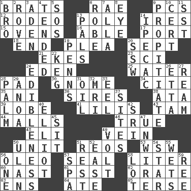 ACROSS 1. Naughty children 6. Actress Charlotte 9. Personal Computers (abbr.) 12. Cowboy competition 13. Much (prefix) 14. Angers 15. Baking chambers 16. Competent 17. Left side of a ship or aircraft 18. Conclusion 19. Entreaty 20. Back-to-school mo. 21. Makes supply last 23. _-fi 24. Paradise 25. Wetness 28. Groovy apt. 30. Dwarf 34. Quote 35. Black tropical American cuckoo 36. Founders of families 38. "One Day ___ Time" 39. Ear part 41. Ms. Damita and namesakes 43. Scottish cap 44. Shopping centers 46. Loyal 48. Connecticut Ivy Leaguer 49. Distinctive style or manner 50. A single undivided whole 51. Vintage cars 53. Compass dir. 56. Margarine 57. Lick closed 58. 61 cubic inches 60. Political cartoonist Thomas 61. Inconspicuous attention getter 62. Speak pompously 63. Followers of ems 64. Had dinner 65. Laconic DOWN 1. Sis' sibling 2. Be footloose 3. An important port of Yemen 4. Looked after 5. Distress signal 6. Loose flowing garment 7. Silent film actress Nazimova 8. Sight organ 9. Appease 10. Sure thing 11. Fast jet (abbr.) 13. Friends 14. Medicinal drug used to evoke vomiting 19. Actor Sean's family 20. Compass dir. 22. Cask 24. The property of being fit to eat 26. Singer James 27. 480, 500 or 516 sheets of paper 28. Inside of hand 29. Small Philippine buffalo 31. Lubricate 32. Medical imaging device (abbr.) 33. Snakelike fish 37. Settings 40. American author Paul (1891-1958) 42. Indian title of respect (Mr.) 45. Be seated 47. Undo the wiring of 49. Electrical Unit 50. ____ Bator, Mongolia 51. Respite 52. Relaxation 54. Play the lead 55. Soaks 56. Single 57. Health resort 58. Car dealer's back yard 59. Portuguese money of account (variant)