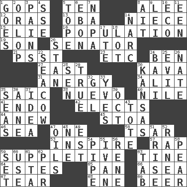 ACROSS 1. Republicans 5. Nine, plus one 8. Toward shelter 12. Mouths or openings 13. Chief or king in Benin or Nigeria 14. Sibling's daughter 15. Writer Wiesel 16. Census information 19. Male child 20. Legislator 21. Inconspicuous attention getter 23. And so on (abbr.) 24. Benjamin's nick name 27. 90 degrees 30. Polynesian shrub of the pepper family 31. Disorder of the immune system 34. Came down and settled, as after flight 35. Ketch in the Levant 38. New (sp.) 40. Mediterranean tributary 41. Inside; within (prefix) 42. Chooses 44. Afresh 45. Portico 46. Ocean 47. Single 50. Russian ruler of old 53. Heighten or intensify 57. Reproach for some lapse or misdeed 59. Supplying deficiencies 63. Prong on a fork 64. _____ Park, CO 65. Baking dish 66. At sea 67. Separate forcefully 68. Compass dir. 69. Fermented drink made from hops DOWN 1. Leaves 2. Fourth or lowest deck 3. Aches 4. Compass dir. 5. Drink excessively 6. Inky black, to poets 7. California wine valley 8. Small island 9. Flowery wreath 10. Environmental prefix 11. Car or cant ending 14. Drug cop 17. Shoshoni 18. Car dealer's back yard 20. Comedian Laurel of Laurel & Hardy 22. Manatee 24. Indonesian resort city 25. Tending to cause great harm 26. Nathan's nickname 28. Elected rep. 29. Loyal 30. Sunflower state 32. Set 33. Jacques Cousteau's middle name 35. Oceans 36. Queen of England 1702-14 37. The main thing one is thinking about 39. Sep. follower 43. Carryall 47. Petroleums 48. Compass dir. 49. Eastern Standard Time (abbr.) 51. Originate 52. Indian princess (variant) 54. Corncob 55. _ the terrible 56. French philosopher Descartes 58. Lightbulb-shaped fruit 59. Put into a specified state 60. Purpose 61. Parent Teacher Assoc. 62. For each 63. Keyboard key