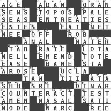 ACROSS 1. Ripen 4. First man 8. Northwest Algerian city 12. Elected reps. 14. Traditional theme or motif 16. Light colored 17. Oceans 18. Pleas 20. _____ Park, CO 22. Consume 23. Remaining after all deductions 24. Born 25. No longer planned or scheduled 28. Director Reiner 30. Of or related to the anus 31. Mother 35. Bar bill 37. Assign a rank or rating to 40. Globular water bottle used in Asia 41. 1994 drama film starring Jodie Foster 42. Make improvements or corrections to 44. Lug 45. Relaxation 46. Object of repulsion 47. R.R. building 48. Came up 50. Southern CA. univ. 52. The 23rd letter of the Hebrew alphabet 54. One more than two 55. _ moment's notice (2 wds.) 58. Quiet! 61. _ Lanka 63. Middle Eastern gold or silver currency 65. Neutralize 70. Trial 71. So be it 72. Relating to the nose 73. Suttee (variant) 74. Thickened enlargement 75. Drug cop 76. To sift DOWN 1. NE Netherlands city 2. Honkers 3. Related on the mother's side 4. Had dinner 5. Spanish title 6. Fitting 7. Greater amount 8. Elect 9. Precipitation 10. Toward shelter 11. Egg locale 13. Compass dir. 15. Scorch 19. Tiny particle 21. Male child 26. Conductor's collection 27. Flambe (short form) 29. Greek mezzo-soprano Agnes 30. Most capable 32. A blast of a horn 33. Singer James 34. Actress Charlotte 35. Lacerate 36. In addition 38. Beverage made from leaves 39. World-weariness 41. Teachers' org. 43. Tenth: prefix 49. Compass direction 51. Flaplike covering 53. Songbird 55. Approach 56. Clothes sense 57. Nick name for Arthur 58. Skim 59. Like (prefix) 60. Took on color 62. SW Asia republic 64. ___ a Wonderful Life 66. Compass dir. 67. White ___ sheet 68. Automobile 69. Affectionate concern, for short