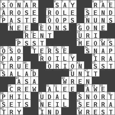 ACROSS 1. Echolocation 6. Declare 9. Actress Charlotte 12. Came up 13. Hero or heavy, e.g. 14. Post 15. Thick mixture 16. I made a mistake 17. Religious women 18. Born 19. Immeasurably long periods of time 20. Went 21. Monthly bill 23. RI univ. 24. Inconspicuous attention getter 25. Catcalls? 28. Bear (Spanish) 30. Laconic 34. Fastener 35. Infant food 36. Turbulent 38. Retirement account (abbr.) 39. Loyal 41. Greek mythologigal hunter 43. Fast jet (abbr.) 44. Vegetable dish 46. A single undivided whole 48. White ___ sheet 49. Songbird 50. Ship's personnel 51. Toward shelter 53. Deep reverence 56. Silvers or Donahue 57. Allodial 58. Derisive sound 60. Arranges properly for use 61. Famous astronaut Armstrong 62. Spanish missionary in California 63. Attempt 64. Indiana (abbr.) 65. Obtain by seizing forcibly or violently DOWN 1. Plant excrement 2. NW Algerian seaport 3. Olfactory organ 4. Michaelmas daisies 5. Portuguese money of account (variant) 6. Within a short period 7. High mountains 8. It is so 9. One who advocates reunion 10. Singer Murray 11. Begley and Asner 13. Carrot, for example 14. Sounds asleep 19. Keyboard key 20. Chewing product 22. Eastern Standard Time (abbr.) 24. Teen's desire 26. Armed conflicts 27. Argument over a trivial matter 28. Elects 29. "Two Mules for Sister ____" 31. Friend of Pooh 32. Title for a knight 33. Connecticut Ivy Leaguer 37. You are 40. Artist's stands 42. Compass dir. 45. Obsolete 47. More lacking in sense or substance 49. Water source 50. "Mermaids" star 51. Arabian gulf 52. Put down 54. Had on 55. Blunders 56. Pacific Standard Time (abbr.) 57. Corn or form start 58. Compass dir. 59. Make lace