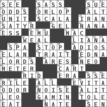 ACROSS 1. Observe 4. Backtalk 8. Take to court 11. Likelihood 13. Fourth or lowest deck 15. Keyboard modifier key 16. A single undivided whole 17. Any of the three canals of the cochlea 18. SW Asia republic 19. Man with strong sexual desires 21. Set 22. Nanny 23. Double-curved letter 24. Australian flightless bird 27. Big _ 29. Welt 30. Climbing, woody, usually tropical vines 34. Health resort 36. Obstruct or block passage 39. Goodbye (Sp.) 40. Liveliness 41. Distinguishing feature 43. Pulitzer Prize-winning author Ferber 44. Domineers 46. Ancient Greek god of war 47. Modern: prefix 48. Distance measurement 49. Haul 51. To free from 53. Period 54. Compass dir. 57. Cause heat under the collar 60. Everything 63. Webber/Rice musical 65. Scent 66. Annoying sound 69. Came down and settled, as after flight 70. Lion 71. Homeless child 72. Lacquered or enameled metalware 73. Erode 74. Nathan's nickname 75. Elected rep. DOWN 1. Lush 2. Ferber et al. 3. Prepares for publication 4. Mayday 5. Curve 6. Volcanic refuse 7. Flatfish 8. "Two Mules for Sister ____" 9. Uhlan (variant) 10. Inactive volcano in Sicily 12. Filthy place 14. Inside of hand 18. Event 20. Portuguese money of account (variant) 25. Vertical spar for supporting sails 26. Extremist 28. In the manner of 29. Nomad 31. Assistant 32. Words to Nanette 33. White ___ sheet 34. A type of plum 35. Piece 37. Boat paddle 38. Part 40. Shade tree 42. Russian ruler of old 45. _ Lanka 50. Actress Charlotte 52. Mild oath, euphamism for damn 54. Grain storage towers 55. Vertical member of a panel or frame 56. Ingested 57. Hero or heavy, e.g. 58. The main thing one is thinking about 59. Plunder 61. Grant temporary use of 62. Pale green bean 64. Large container 67. Be seated 68. Compass dir.