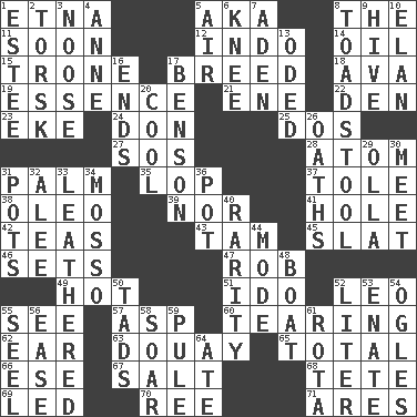 ACROSS 1. Inactive volcano in Sicily 5. Alias (abbr.) 8. Definite Article 11. Within a short period 12. _ china 14. Petroleum 15. Marketplace scale 17. A special lineage 18. Actress Gardner 19. Center 21. Compass dir. 22. Lair 23. Make supply last 24. Spanish title 25. Two (Sp.) 27. Mayday 28. Tiny particle 31. Inside of hand 35. Trim (branches) 37. Lacquered or enameled metalware 38. Margarine 39. Not either 41. Opening into or through something 42. Afternoon social gatherings 43. Scottish cap 45. Narrow board 46. Arranges properly for use 47. Director Reiner 49. Being at a high temperature 51. Wedding promise 52. Lion 55. Observe 57. Viper 60. Pulling apart 62. Hearing organ 63. A city in N France, SE of Calais 65. "_____ Recall" 66. Compass dir. 67. Table seasoning 68. False hair 69. Directed 70. To riddle 71. Ancient Greek god of war DOWN 1. First name in cosmetics 2. Cod relative 3. Trap for birds or small mammals 4. Singer Murray 5. Wind 6. Leg joint 7. An important port of Yemen 8. Inedible or poisonous agaric 9. Hub of activity 10. Liveliness 13. Wrote a lyric poem 16. Extremities 17. Gillaume's butler role 20. Calm and collected 26. Profane or obscene expressions 29. Water jar 30. Rendezvous 31. Cooking vessels 32. Toward shelter 33. Resembling or made to resemble leather 34. With motion or animation 36. Cooking vessel 40. Noteworthy scarcity 44. Method 48. Water vessel 50. Small amounts or degrees 52. 61 cubic inches 53. Related on the mother's side 54. Stares 55. Sew up the eyelids of hawks and falcons 56. Comfort 58. Fly high 59. Whine 61. Round or rotation of duties 64. Had dinner