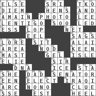 ACROSS 1. Otherwise 5. Indian title of respect (Mr.) 8. Ring climax 11. South Vietnam president (1954) 12. Coop moms 14. Plus 15. At full speed 17. Picture 18. Area sheltered from the wind 19. Small, flat, pigmented spot on the skin 21. "Barney Miller" actor Jack 22. Directed 23. Double-curved letter 24. Chop off 25. Fish or hair follower 27. Snakelike fish 28. Sinks 31. Old wives' tales, e.g. 35. Be seated 37. Jai ____ 38. Length times width 39. Lower and raise head in agreement 41. Peachy ____! 42. Vertical spar for supporting sails 43. Set 45. Capri or Wight 46. Writer Wiesel 47. Title for a knight 49. Heredity factor (abbr.) 51. Frozen water 52. R.R. building 55. A female animal or person 57. Male parent 60. Legislator 62. Car or cant ending 63. Opt 65. Resident of Iraq 66. Curve 67. Words to Nanette 68. A slight indication 69. Compass dir. 70. Eastern Standard Time (abbr.) 71. Person who is morally reprehensible DOWN 1. Peak District village in England 2. Citrus fruits 3. Seines 4. Give off 5. Quiet! 6. Vintage cars 7. To the inside or interior of 8. Baron Munchausen's specialties 9. Leg joint 10. Wrote a lyric poem 13. Within a short period 16. Mediterranean tributary 17. Cotton for raincoats, e.g. 20. Leaves 26. 1973 Nobel Price Winner (Physics) Leo 29. Highlander 30. Trig term 31. Unable to walk 32. Of the mouth 33. Home 34. Consumed 36. Coat; cloak 40. Cease 44. Louse (plural) 48. Painter Guido (1575-1642) 50. An important port of Yemen 52. Having lost freshness 53. Woman's close-fitting hat 54. Satellite of Uranus 55. Oceans 56. Possessive pronoun 58. Medicinal plant 59. Cub Scout units 61. Bowlike part 64. Small bed