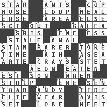ACROSS 1. Play the lead 5. Pismires 9. Police officer (slang) 12. Stockings 13. Central Nebraska county 14. Be tempered by heat 15. Celtic language 16. Type of rug 17. Otherwise 18. _-fi 19. Fr. "Yes" 21. An organ shaped like a helmet 22. Indian titles of respect 24. She-sheep 26. Double-curved letter 27. Having lost freshness 28. Of or related to the anus 29. Comedian Laurel of Laurel & Hardy 30. More uncommon 32. Puff or smoke 36. Prong on a fork 37. Direct toward a target or goal 38. Toward the sea 39. Johnson of "Laugh-In" 40. Trading vessels 42. Proofreading order 43. Period of immesurable duration 44. Consumed 46. Eastern Standard Time (abbr.) 49. Male offspring 50. Songbird 51. Empty completely 53. Compass dir. 54. Elected rep. 57. Frog relative 58. Actor Griffith 61. Periodic rise and fall of the sea level 62. Writer Wiesel 63. Erode 64. Advice 65. Put into a specified state 66. Ear part 67. Rendezvous DOWN 1. "______ My Girl" (Turtles hit) 2. Torque (variant) 3. Aide 4. To separate or throw off 5. Mountain range southwest of Kyrgyzstan 6. And not 7. Third day of the wk. 8. Health resort 9. Cell (Danish) 10. Fertile tracts in a desert 11. Entreaties 14. Teachers' org. 19. Lubricate 20. One who uses or employs something 21. Set 23. Indian princess (variant) 24. Foe 25. Armed conflict 27. Move through with a circular motion 28. Believer in; advocate of (suffix) 29. R.R. building 31. Composer Copland 32. Clothes sense 33. Clearly or manifestly demonstrative 34. Peachy ____! 35. Erode 40. Corporate head (abbr.) 41. Stitched 43. Cleo's killer 45. "We ___ not amused" (Victoria) 46. _____ Park, CO 47. Took without asking 48. Distinguishing feature 52. Binary compound 53. Jane of fiction 55. Singer Brickell 56. Egg locale 58. Leather borer 59. Modern: prefix 60. Small moist lump or mass 61. Scottish cap