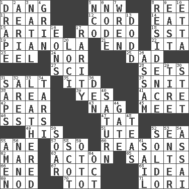 ACROSS 1. Mild oath, euphamism for damn 5. Compass dir. 8. Portuguese money of account (variant) 11. Posterior 12. Drawstring 14. Erode 15. Nick name for Arthur 17. Cowboy competition 18. Fast jet (abbr.) 19. Player piano 21. Conclude 22. Call ___ day 23. Snakelike fish 24. And not 25. June honoree 27. _-fi 28. Arranges properly for use 31. Table seasoning 35. It would 37. In a ____ (agitated or irritated) 38. Length times width 39. Affirmative reply 41. 43,560 square feet 42. Lightbulb-shaped fruit 43. Tired old horse 45. Rendezvous 46. Fast planes 47. Make lace 49. Part of HMS, perhaps 51. Shoshoni 52. Ocean 55. A saturated hydrocarbon 57. Bear (Spanish) 60. Thinks logically 62. Spoil 63. NE Massachussets city 65. Table seasonings 66. Compass dir. 67. College mil. group 68. The main thing one is thinking about 69. Lower and raise head in agreement 70. Small child 71. Australian parrot (variant) DOWN 1. Window treatment 2. Nest on high 3. Brizilian seaport 4. Broad smile 5. Non-commissioned officer (abbr.) 6. Connecting point 7. Songbird 8. Home 9. 90 degrees 10. Singer James 13. Texas town _ City 16. Immeasurably long periods of time 17. Noteworthy scarcity 20. Event scenes 26. Indian state 29. Hoop that covers a wheel 30. Proofreading order 31. Plant excrements 32. Ancient Greek god of war 33. Tough but pliablecoriaceous 34. Tarsus (plural) 36. Lair 40. Titan orbits this 44. Yard entry 48. Beverages made from leaves 50. Fly high 52. Twentieth part of a lira 53. Keyboard key 54. Slender Brazilian palm 55. So be it 56. Billionth: prefix 58. Native of Scotland 59. Von Bismarck 61. Travel by water 64. Sep. follower
