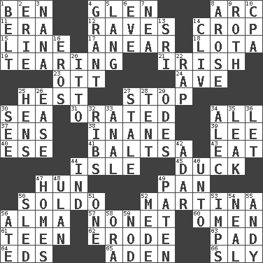 ACROSS 1. Benjamin's nick name 4. Small, secluded valley 8. Curve 11. Epoch 12. All-night dance parties 14. Riding implement 15. Actor's bit 17. Approach 18. Globular water bottle used in Asia 19. Pulling into pieces 21. From or relating to Ireland 23. Baseball player Mel 24. "___ Maria" 25. Behest 27. Halt 30. Ocean 31. Spoke pompously 34. 100% 37. Followers of ems 38. Silly 39. Area sheltered from the wind 40. Compass dir. 41. Greek mezzo-soprano Agnes 43. Ingest 44. Small island 45. Evade 47. Attila the _ 49. Baking dish 50. Twentieth part of a lira 52. Chrissie's court nemesis 56. _ mater 57. Music written for nine 60. Presage 61. Adolescent 62. Eat (away) 63. Writing tablet 64. Begley and Asner 65. An important port of Yemen 66. Wily DOWN 1. Waist strap 2. 4th largest of the Great Lakes 3. Grandmother 4. Let have 5. Long (Scottish) 6. First lady 7. Teachers' org. 8. Came up 9. Writer of Portnoy's Complaint (1969) 10. Accounting whiz (abbr.) 13. Indian title of respect (Mr.) 14. 154 in Roman numerals 16. Greek god of love 20. "Tell ____ the Marines!" 22. Hit sharply and swiftly 25. Coop moms 26. Relaxation 27. Lacking originality or spontaneity 28. Portable shelter 29. Lyric poems 30. Perceive with the eye 32. Teases 33. Of or related to the anus 34. Actor Baldwin 35. Path through which fluid escapes 36. Allow 42. The sixth month of the Jewish calendar 44. Indiana (abbr.) 46. To (old English) 47. Dwellings 48. ____ Bator 49. Eucharist need 50. Downhill vehicle 51. Single 52. Ancient Persian 53. Naughty children 54. Actress Patricia 55. Actor Griffith 56. Had dinner 58. Mouth or opening 59. Dreamland