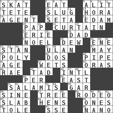 ACROSS 1. Three-handed card game 5. Erode 8. Set down 12. Wig 13. Strike heavily 15. Israeli folk dance 16. Rep 18. Stalk of a moss capsule 19. Dutch treat 20. Infant food 22. Window treatment 24. One of the Great Lakes 26. Male parent 27. Christmas carol 28. Morning condensation 29. Compass dir. 32. Comedian Laurel of Laurel & Hardy 35. Uhlan (variant) 37. Can I? 38. Much (prefix) 39. Two (Sp.) 40. Corncob 41. Mature 42. Moistens 43. Mouths or openings 44. Actress Charlotte 45. Small amount or degree 46. International (abbr.) 49. For each 50. 90 degrees 51. Deli grouping 55. Slender fish 56. Trig term 57. Relationship diagram 59. Cowboy competition 63. Thick slice 64. Coop moms 65. Singles 66. Lacquered or enameled metalware 67. Compass dir. 68. Billionth: prefix DOWN 1. R.R. building 2. Cask 3. Had dinner 4. 3-inch nail 5. Curvy letter 6. Actor Baldwin 7. Ballerina skirt 8. Toward the future 9. Farming town in central California 10. SW Asia republic 11. Scottish cap 14. Place where plants grow 17. Edible starchy tuberous root 21. Sliced dessert 23. The 23rd letter of the Hebrew alphabet 25. Evaded 28. Small ungulate mammals of Africa 29. Independent ruler or chieftain 30. California wine valley 31. Snake ____ (dice throw) 32. Practice fight 33. Ancient Roman robe 34. Toward shelter 36. Car dealer's back yard 40. Coward 42. Heat 45. Beverage made from leaves 47. Tired old horse 48. Russian ruler of old 49. Cadet 51. Grain storage tower 52. Of or related to the anus 53. Angers 54. Elected reps. 56. Fast jet (abbr.) 58. Compass dir. 60. Heredity factor (abbr.) 61. Car or cant ending 62. Bear (Spanish)