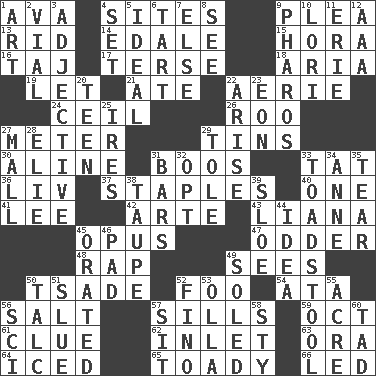 ACROSS 1. Actress Gardner 4. Settings 9. Entreaty 13. To free from 14. Peak District village in England 15. Israeli folk dance 16. _ Mahal 17. Laconic 18. Roberta Peters solo 19. Allow 21. Had dinner 22. Nest on high 24. To provide with a ceiling 26. Friend of Pooh 27. Distance measurement 29. Canisters 30. Place in a line 31. Scornful sounds 33. Make lace 36. 54 in ancient Rome 37. Paper fasteners 40. Single 41. Area sheltered from the wind 42. Johnson of "Laugh-In" 43. Climbing, woody, usually tropical vines 45. Musical composition 47. More peculiar 48. Hit sharply and swiftly 49. Observes 50. Sadhe (variant) 52. Egg _ yung 54. "One Day ___ Time" 56. Table seasoning 57. Beverly of Met fame 59. Sep. follower 61. A slight indication 62. An arm off of a larger body of water 63. Mouth or opening 64. On the rocks 65. Sycophant 66. Directed DOWN 1. Nonscientific branch of learning 2. Small bottle 3. Descriptive word 4. Arrange properly for use 5. Standard of perfection 6. Small pie 7. Otherwise 8. Observe 9. N Egypt peninsula 10. Australian parrot (variant) 11. One of the Great Lakes 12. Auto club (abbr.) 20. Adolescent 22. Get up 23. Period of immesurable duration 25. Angers 27. Promenade 28. Writer Wiesel 29. Lacquered or enameled metalware 31. Long, evenly shaped pieces 32. Choose 33. Inedible or poisonous agaric 34. Queen of England 1702-14 35. Pull into pieces 38. Grayish beige 39. A type of plum 44. The main thing one is thinking about 45. Spoke pompously 46. Groovy apt. 49. Having a sole or soles 50. Baby powder 51. Turn sharply 52. Fine (Spanish) 53. Spanish pot 55. 43,560 square feet 56. _-fi 57. Be seated 58. Filthy place 60. Small amount or degree