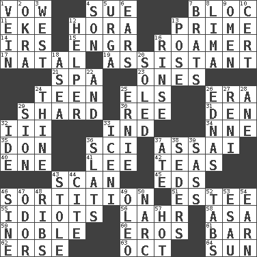 ACROSS 1. Solemn pledge 4. Take to court 7. Alliance 11. Supplement with great effort 12. Israeli folk dance 13. A-one 14. Big collection agency 15. Engineer (abbr.) 16. Nomad 17. Brizilian seaport 19. Aide 21. Health resort 23. Washington bills 24. Adolescent 25. Raised railways 26. Period 29. Broken piece 30. To riddle 31. Lair 32. One more than two 33. Working for oneself (abbr.) 34. Compass dir. 35. Spanish title 36. _-fi 37. Slender Brazilian palm 40. Compass dir. 41. Area sheltered from the wind 42. Afternoon social gatherings 43. Skim 45. Begley and Asner 46. Decision 51. First name in cosmetics 55. Foolish or stupid persons 56. Cowardly lion portrayer 58. White ___ sheet 59. Impressive in appearance 60. Greek god of love 61. Drinking establishment 62. Celtic language 63. Sep. follower 64. Player for Phoenix DOWN 1. Distinctive style or manner 2. Gumbo ingredient 3. Compass direction 4. Male offspring 5. Capital and largest city of Mongolia 6. Hearing organs 7. Naughty children 8. Pale green bean 9. Presage 10. Foregone conclusion 12. Assistant 13. Introduce or present, as a question 16. Wash lightly 18. Toward the sea 20. Having a sole or soles 22. Added to 24. One or ones belonging to thee 25. Bert's buddy 26. Ferber et al. 27. Painter Guido (1575-1642) 28. One (Scot) 29. The Jewish people; Israel 32. Binary compound 33. Ancient Celtic tribe of eastern Britain 36. Narrow boards 37. Had dinner 38. Spring feasts 39. Backtalk 43. Took without asking 44. Quote 46. Trig term 47. Aroma 48. Chest bones 49. Margarine 50. Drug cop 52. Bar bills 53. Son of Isaac 54. Merit 57. Being at a high temperature