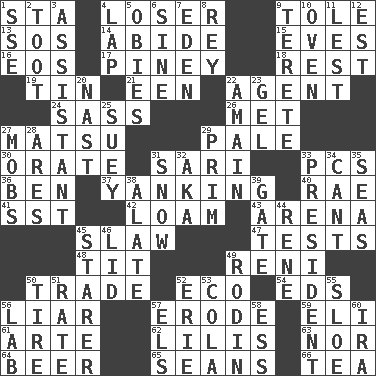 ACROSS 1. R.R. building 4. Failure 9. Lacquered or enameled metalware 13. Distress signal 14. Stay 15. Nights before holidays 16. Greek goddess of the dawn 17. Abounding in pines 18. Respite 19. Metal container 21. Car or cant ending 22. Rep 24. Backtalk 26. Was introduced to 27. Taiwanese island in East China Sea 29. Diluted with white 30. Speak pompously 31. Indian skirt 33. Personal Computers (abbr.) 36. Benjamin's nick name 37. Pulling suddenly and vigorously 40. Actress Charlotte 41. Fast jet (abbr.) 42. Rich soil 43. Sports stadium 45. Cole _ (cabbage dish) 47. Trials 48. Teat (slang) 49. Painter Guido (1575-1642) 50. Exchange 52. Environmental prefix 54. Begley and Asner 56. One who doesn't tell the truth 57. Wear away 59. Connecticut Ivy Leaguer 61. Johnson of "Laugh-In" 62. Ms. Damita and namesakes 63. Not either 64. Fermented drink made from hops 65. Seines 66. Afternoon social gathering DOWN 1. Compass dir. 2. A blast of a horn 3. Aide 4. Pet locale 5. Off-Broadway awards 6. Trig term 7. Genesis locale 8. Marina Del _, California 9. Cylindrical with tapered ends 10. Baking chamber 11. For fear that 12. Eastern Standard Time (abbr.) 20. Political cartoonist Thomas 22. At full speed 23. Set 25. Chop _ 27. Crowds into 28. Ancient Greek god of war 29. Demure 31. Frozen precipitation 32. Alias (abbr.) 33. Elected leader of a country 34. Patter 35. Oceans 38. Having winglike extensions 39. Yard entry 44. French philosopher Descartes 45. A viewer who gazes fixedly 46. Flaplike covering 49. "The Thinker" sculptor 50. Hoop that covers a wheel 51. Pace 52. 4th largest of the Great Lakes 53. Root beer relative 55. A type of plum 56. Experiment locale 57. Raised railways 58. Double-curved letter 60. Retirement account (abbr.)
