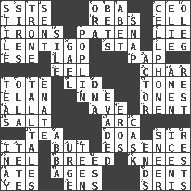 ACROSS 1. Fast planes 5. Chief or king in Benin or Nigeria 8. Corporate head (abbr.) 11. Hoop that covers a wheel 12. Confederate soldiers (slang) 14. Pipe bend 15. Metal shackles 17. Eucharist need 18. Whopper 19. Small, flat, pigmented spot on the skin 21. R.R. building 22. Part of a journey 23. Compass dir. 24. Infant locale 25. Infant food 27. Snakelike fish 28. Burn to charcoal 31. Carryall 35. Flaplike covering 37. Heavy book 38. Liveliness 39. Compass dir. 41. Singles 42. Silent film actress Nazimova 43. "___ Maria" 45. Monthly bill 46. Table seasoning 47. Curve 49. Beverage made from leaves 51. ___ good deed 52. Title for a knight 55. Call ___ day 57. With the exception that 60. Substance 62. Cartoonist voice _ Blanc 63. A special lineage 65. Leg joints 66. Had dinner 67. Matures 68. Gouge 69. It is so 70. Followers of ems 71. Indian titles of respect DOWN 1. Vertical member of a panel or frame 2. Begets 3. Heavy duty weighing machine 4. Transmitted 5. Mouth or opening 6. Stakes 7. Collude with 8. Portable communications device 9. Writer Wiesel 10. Cassini of fashion 13. Fastener 16. Drop; flow; fall 17. Cotton for raincoats, e.g. 20. Highlander 26. Thespian 29. So be it 30. Relief 31. Beverages made from leaves 32. Water jar 33. Baron Munchausen's specialties 34. Related on the mother's side 36. Heredity factor (abbr.) 40. Eluded 44. Greek god of love 48. Keg 50. Swedish rock group 52. Scornful expression 53. Ancient Celtic tribe of eastern Britain 54. Musical pauses 55. "If ____ say so..." 56. False hair 58. Goad 59. Adolescent 61. Extremities 64. Double-curved letter