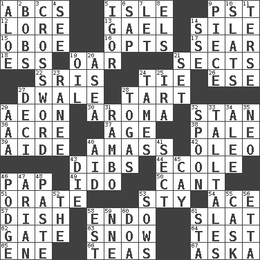 ACROSS 1. Lettered men learn these first 5. Small island 9. Pacific Standard Time (abbr.) 12. Old wives' tales, e.g. 13. Highlander 14. Filth; sediment 15. Mitch Miller's instrument 16. Elects 17. Burn superficially 18. Double-curved letter 19. Rowing implement 21. Religious groups 22. Indian titles of respect 24. Neckwear 26. Compass dir. 27. A sleeping potion; an opiate (poet.) 28. Small pie 29. Period of immesurable duration 30. Scent 32. Comedian Laurel of Laurel & Hardy 36. 43,560 square feet 37. Grow older 38. Diluted with white 39. Assistant 40. Collect or gather 42. Margarine 43. Rights 44. Learning spot: Fr. 46. Infant food 49. Wedding promise 50. Patter 51. Speak pompously 53. Filthy place 54. Adept person 57. Food container 58. Inside; within (prefix) 61. Narrow board 62. Yard entry 63. Frozen precipitation 64. Trial 65. Compass dir. 66. Beverages made from leaves 67. "____ silly question..." DOWN 1. Medicinal plant 2. Moves up and down 3. What you're doing now 4. Perceive with the eye 5. Composer Stravinsky 6. Plant excrement 7. Allow 8. Raised railways 9. Part 10. Narrow boards 11. Laconic 14. Compass dir. 19. Petroleum 20. At sea 21. Put into a specified state 23. The wife of a rajah (variant) 24. Softens 25. Lyricist Gershwin 27. Tenth: prefix 28. Ancient Roman robes 29. American Automobile Association (abbr.) 31. Role for Stallone 32. Soup utensil 33. Baron Munchausen's specialties 34. Toward shelter 35. Modern: prefix 40. Assist 41. Religious group 43. Expire 45. Island 46. Porridge 47. Believer in; advocate of (suffix) 48. Thick mixture 52. Definite Article 53. Sty mamas 55. Keg 56. Singer James 58. Eastern Standard Time (abbr.) 59. Compass dir. 60. ___ good deed 61. R.R. building