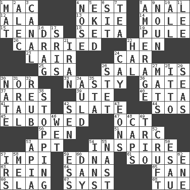 ACROSS 1. Apple computer (short form) 4. A home for chicks 8. Of or related to the anus 12. Chicken ___ king 13. Migrant worker of the '30s 14. Undercover agent 15. Looks after 18. Bristle 19. Whine 20. Borne 22. Layer 23. Den 24. Auto 25. Girls' org. (abbr.) 26. Deli grouping 30. And not 33. Characterized by obscenity 36. Yard entry 37. Ancient Greek god of war 39. Shoshoni 40. Singer James 41. Pulled tight 42. Chalkboard 44. Distress signal 45. Turned at an angle; bent 47. Sep. follower 50. Writing instrument 51. Drug cop 53. Fitting 54. Motivate 57. Body of Kaffir warriors 59. Pulitzer Prize-winning author Ferber 61. Lush 63. It's straight from the horse's mouth 64. Without 65. Avid follower 66. Volcanic refuse 67. System (abbr.) 68. Third day of the wk. DOWN 1. Floor protector 2. Actor Baldwin 3. Lessep's creation 4. Olfactory organ 5. Made supply last 6. Be seated 7. Afternoon social gathering 8. Electrical Measurement 9. Part of speech 10. Everything 11. Area sheltered from the wind 16. To draw with force 17. Indian titles of respect 21. SW Asia republic 22. Actor Linden 24. Island 26. Proofreading order 27. Floor protectors 28. "Tell ____ the Marines!" 29. Oceans 30. Nathan's nickname 31. Taken by mouth 32. Reuben's nickname 34. Old (Scot.) 35. R.R. building 38. Halting 42. Elected rep. 43. Immeasurably long periods of time 46. Soggy 48. Smile enhancers 49. Musical group of three 52. An unpleasant substance 53. Capital of Western Samoa 54. Taverns 55. Political cartoonist Thomas 56. He sold his birthright 57. Big collection agency 58. Cartoonist voice _ Blanc 59. Curvy letter 60. 24 hours 62. Compass dir.
