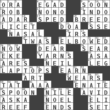 ACROSS 1. Mouth or opening 4. Mild oath 8. Within a short period 12. Director Reiner 13. Words to Nanette 14. Southeast Asian peninsula 15. The sixth month of the Jewish calendar 17. Moved rapidly 18. A special lineage 19. It is permitted: Lat. 21. ___ good deed 23. Compass dir. 24. Relating to the nose 26. Big collection agency 28. It was, poetically 30. Shoved, as through a crowd 34. At this time 37. Letter starter 39. Singe 40. Supplement with great effort 41. Tall tales 43. White ___ sheet 44. Ancient Greek god of war 46. Famous astronaut Armstrong 47. Part of a journey 48. Portable computers 51. Merit 54. Tate display 55. Erodes 58. Make lace 61. Auto club (abbr.) 63. Maternal 65. Soup utensil 67. The longest river in the world 71. Enthusiastic 72. "____ silly question..." 73. Christmas carol 74. Biblical high priest 75. Coral ridge 76. Extremities 77. Put into a specified state DOWN 1. Of the mouth 2. "The Thinker" sculptor 3. Phillipine bananalike plant 4. Followers of ems 5. Republican Party 6. A saturated hydrocarbon 7. Texas town _ City 8. Title for a knight 9. Washington bills 10. Lyric poems 11. Thickened enlargement 16. Respite 18. Sharp remark 20. The 23rd letter of the Hebrew alphabet 22. Petroleum 25. Kenny Rogers chart-topper in '80 27. Distress signal 29. Seines 30. Bert's buddy 31. Welt 32. Comfort 33. To draw with force 34. Be tempered by heat 35. Gumbo ingredient 36. Shed a tear 38. "We ___ not amused" (Victoria) 42. Cole _ (cabbage dish) 45. R.R. building 49. NW Algerian seaport 50. Parent Teacher Association (abbr.) 52. To riddle 53. Nanny 56. All-night dance parties 57. Vertical member of a panel or frame 58. Russian ruler of old 59. Domed church section 60. Puff or smoke 62. Singer Murray 64. Prepare for publication 66. Clumsy lout 68. Electrically charged atom 69. Directed 70. Raised railways