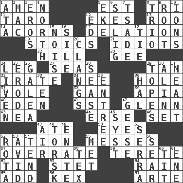 ACROSS 1. So be it 5. Eastern Standard Time (abbr.) 8. Three (prefix) 11. Edible starchy tuberous root 12. Supplements with great effort 13. Friend of Pooh 14. Oak nuts 17. Accusation by an informer 19. Unemotional ones 21. Foolish or stupid persons 22. Land elevation 23. Unit of force equal to gravity 24. Part of a journey 27. Oceans 29. Scottish cap 32. Feeling or showing extreme anger 34. Born 36. Opening into or through something 37. Short-tailed, large-bodied rat 38. Separate the seeds from cotton 39. Capital of Western Samoa 40. Genesis locale 41. Fast jet (abbr.) 42. American astronaut and politician John 43. Teachers' org. 44. Celtic language 46. Arrange properly for use 47. Had dinner 50. Sight organs 52. Food allowance for one day 55. Makes clutter 57. Make much ado about nothing 59. Cigar-shaped 62. Shallow baking pan 63. Proofreading order 64. Precipitation 65. Find the sum of 66. A weed 67. Johnson of "Laugh-In" DOWN 1. "One Day ___ Time" 2. Big _ 3. Greek god of love 4. Compass direction 5. Supplement with great effort 6. Major League Baseball Commissioner Bud 7. Sadhe (variant) 8. Musical group of three 9. Carrot, for example 10. Charged atoms 12. Begley and Asner 15. Annoying sound 16. Drop; flow; fall 18. Neckwear 20. Rings loudly 24. Make or become more lively 25. Wear away 26. An organ shaped like a helmet 28. Gospel singer Marvin 29. Drinks excessively 30. Place in a line 31. Intended 33. Nine, plus one 35. Main course 36. Actor Linden 42. Honkers 45. System (abbr.) 47. Wind 48. Cod relative 49. Related on the mother's side 51. Father Junipero _ 52. Roll call or roster of names 53. Enthusiastic 54. Look after 55. Was introduced to 56. Singe 58. John Ritter's dad 60. Teat (slang) 61. Compass dir.