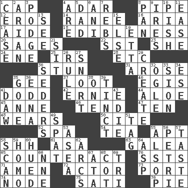 ACROSS 1. Head covering 4. The sixth month of the Jewish calendar 8. Corncob 12. Greek god of love 14. The wife of a rajah (variant) 16. Operatic vocal solo 17. Assistant 18. The property of being fit to eat 20. Gurus 22. Fast jet (abbr.) 23. A female animal or person 24. Compass dir. 25. Big collection agency 28. And so on (abbr.) 30. Make senseless or dizzy 31. Came up 35. Turn to the right 37. Spoils 40. Armor plate that protects the chest 41. Texas town _ City 42. Bert's buddy 44. _ vera 45. Queen of England 1702-14 46. Look after 47. Nine, plus one 48. Puts on (as clothing) 50. Quote 52. Health resort 54. Afternoon social gathering 55. Fitting 58. Quiet! 61. White ___ sheet 63. An organ shaped like a helmet 65. Frustrate 70. Fast planes 71. So be it 72. Thespian 73. Left side of a ship or aircraft 74. Connecting point 75. Suttee (variant) 76. Sliced dessert DOWN 1. Desist 2. Believer in; advocate of (suffix) 3. Plash 4. "We ___ not amused" (Victoria) 5. Male parent 6. Cuckoo 7. Confederate soldiers (slang) 8. Baking dish 9. Angers 10. Expression of disdain 11. Relaxation 13. Observe 15. Otherwise 19. Singer James 21. Be seated 26. General guideline 27. Derisive sound 29. Cause to be 30. Spring feasts 32. Stare at amorously 33. The Jewish people; Israel 34. Compass dir. 35. Went 36. Pulitzer Prize-winning author Ferber 38. Single 39. A color or tint 41. Fool 43. Singer Brickell 49. Argument over a trivial matter 51. Label 53. Toward the sea 55. Columnist Joseph or Stewart 56. _ dish (used to culture cells) 57. Clothes sense 58. Examine minutely or intensely 59. Same (prefix) 60. Took on color 62. Arches 64. Cleo's killer 66. Compass dir. 67. _ moment's notice (2 wds.) 68. Small bed 69. Three (prefix)