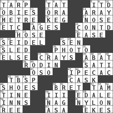 ACROSS 1. Canvas cover 5. Make lace 8. It would 11. Off-Broadway awards 13. Mouth or opening 14. Like ___ of sunshine 15. Distance measurement (Brit.) 16. Cask 17. Olfactory organ 18. And so on (abbr.) 19. Matures 21. Continued (abbr.) 22. Flexible conduit 24. Comfort 25. A glass for beer 27. Elected rep. 29. Downhill vehicle 30. Picture 32. Otherwise 33. Trading vessels 35. Blind as ____ 39. "The Thinker" sculptor 41. Suttee (variant) 42. Bear (Spanish) 43. Medicinal drug used to evoke vomiting 45. Cook's measure (abbr.) 48. Keg 49. Imelda's hoard 50. Cy Young winner Saberhagen 52. Scottish cap 55. Prong on a fork 56. One more than two 57. Peak District village in England 59. Restaurants 60. Tired old horse 61. High-strength synthetic material 62. To sift 63. White ___ sheet 64. Supplements with great effort DOWN 1. Heavy book 2. Collude with 3. Actors Guy, Robert Welles, and Clint 4. For each 5. Puff or smoke 6. Ancient Greek god of war 7. Label 8. Removes the wrinkles 9. Clothes sense 10. Colored 12. Gospel singer Marvin 14. Small Philippine buffalo 20. Set 21. Penny 23. More peculiar 25. Compass dir. 26. Pipe bend 27. Like a shrinking violet 28. Greek goddess of the dawn 30. Baking dish 31. Fertile tracts in a desert 33. Music discs 34. _ de Janeiro 36. Sass 37. _ moment's notice (2 wds.) 38. Nervous spasm 40. I made a mistake 43. Frozen water 44. Eucharist need 45. One or ones belonging to thee 46. Maid-servant 47. Perceives with the eye 49. Move through with a circular motion 50. Prejudice 51. Port city in Latvia 53. _ vera 54. Not women's 56. _ tizzy (2 wds.) 58. Color