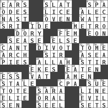 ACROSS 1. Hearing organs 5. Narrow board 9. Health resort 12. Lyric poems 13. Louse (plural) 14. Actor Baldwin 15. Political cartoonist Thomas 16. Baking chamber 17. Electrical Unit 18. Indian title of respect (Mr.) 19. Binary compound 21. Paris' subway 22. Rowboat 24. Opposite of masc. 26. Period of immesurable duration 27. Gospel singer Marvin 28. Otherwise 29. Patter 30. A piece of turf (Scot.) 32. Heavy book 36. Bowlike part 37. Title for a knight 38. At sea 39. Sliced desserts 40. Assad's deity 42. Agitate 43. Supplements with great effort 44. Ingested 46. Curvy letter 49. Large container 50. So be it 51. Showing deterioration from age 53. Tax preparer (abbr.) 54. Institute legal proceedings 57. Carry 58. "Two Mules for Sister ____" 61. Actor's bit 62. Writer Wiesel 63. Taken by mouth 64. Morally bad or wrong 65. Elected rep. 66. Sew up the eyelids of hawks and falcons 67. Arranges properly for use DOWN 1. Immeasurably long periods of time 2. The sixth month of the Jewish calendar 3. Home 4. Fast jet (abbr.) 5. A type of plum 6. 54 in ancient Rome 7. Adept person 8. Nine, plus one 9. Chalkboard 10. Stone: prefix 11. NE Massachussets city 14. Deep reverence 19. Big collection agency 20. Colored 21. Madame (abbr.) 23. Profane or obscene expressions 24. Plants 25. Eastern Standard Time (abbr.) 27. Indian skirt 28. Vices 29. Head covering 31. Small island 32. Clothes sense 33. Clearly or manifestly demonstrative 34. Count _ (2 wds.) 35. Hearing organ 40. Alias (abbr.) 41. Pile 43. Night before a holiday 45. Wet nurse (var.) 46. _____ Park, CO 47. Took without asking 48. Smooth fabric 52. Area sheltered from the wind 53. Give a ring to 55. A single undivided whole 56. Snakelike fish 58. Distress signal 59. "We ___ not amused" (Victoria) 60. Actress Charlotte 61. French article