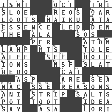 ACROSS 1. Is not 5. Sep. follower 8. Three (prefix) 11. A type of plum 12. Vintage cars 14. Rowing implement 15. Plunders 17. Japanese poetic form 18. _ moment's notice (2 wds.) 19. Core 21. Directed 22. Lair 23. Definite Article 24. According to 25. Mayday 27. For each 28. Tiny particle 31. Desk light 35. Mountains (abbr.) 37. Lacquered or enameled metalware 38. Toward shelter 39. Observe 41. Hollow 42. Charged atoms 43. Science/research agcy. 45. Narrow board 46. Make new 47. Feline 49. Cleo's killer 51. "We ___ not amused" (Victoria) 52. Ocean 55. Big _ 57. Compass dir. 60. Thinks logically 62. Black tropical American cuckoo 63. Long narrow piece of something 65. Table seasonings 66. Plant holder 67. A blast of a horn 68. The content of cognition 69. Declare 70. White ___ sheet 71. Australian parrot (variant) DOWN 1. Small island 2. Splash clumsily 3. Trap for birds or small mammals 4. Wig 5. Mouth or opening 6. To provide with a ceiling 7. Puff or smoke 8. Inedible or poisonous agaric 9. Pace 10. SW Asia republic 13. Beer foam 16. Fastener 17. Centers 20. Clement's nick name 26. Profane or obscene expressions 29. Water jar 30. Rendezvous 31. Den 32. _ vera 33. Ananias' fault 34. Mexican monetary units 36. Elected rep. 40. Fortification 44. Conductor's collection 48. Beverages made from leaves 50. Inconspicuous attention getter 52. Twentieth part of a lira 53. Keyboard key 54. Slender Brazilian palm 55. Atlas contents 56. Small Philippine buffalo 58. Portico 59. Greek god of love 61. Move on water 64. Call ___ day