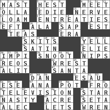 ACROSS 1. Vertical spar for supporting sails 5. Behest 9. Confront 13. Rounded earthenware pot or jar 14. Singer Brickell 15. Boldness 16. Rich soil 17. Pleas 19. Newt 20. Insect wing 21. Plant excrement 22. Eastern Standard Time (abbr.) 23. Afternoon social gatherings 25. Epoch 26. Burlesque acts 30. Shout 34. Smooth fabric 35. Writer Wiesel 36. Body of Kaffir warriors 39. Snout, nose 42. Cuts off 43. Vintage cars 44. Take or capture by force 46. Came down and settled, as after flight 47. Before Barbara or Clara 48. Daniel's nick name 51. He sold his birthright 54. Compass dir. 57. Santa ___, CA 58. Plant holder 60. From 62. Household entertainment appliance 65. Play the lead 66. Smutty 67. Land measure 68. Stalk of a moss capsule 69. Actor Baldwin 70. Allows 71. Songbird DOWN 1. Undercover agent 2. Upward 3. Chalkboard 4. Scottish cap 5. Person who is morally reprehensible 6. Pulitzer Prize-winning author Ferber 7. Be seated 8. Laconic 9. Was introduced to 10. One of the Great Lakes 11. Nights before holidays 12. Trial 15. California wine valley 18. Ewer handle 20. "____ silly question..." 24. Aid 27. It is 28. Metal container 29. Overwhelms 30. Gossips 31. Biblical high priest 32. Mouth edge 33. French article 36. Lyricist Gershwin 37. Cartoonist voice _ Blanc 38. Luau course 40. Mouth or opening 41. "___ Little Indians" 45. Proofreading order 48. American folk hero Crockett 49. Black tropical American cuckoo 50. Rhinal 52. Following 53. A salt of uric acid 54. Inactive volcano in Sicily 55. Lick closed 56. Otherwise 58. Sweet dark-red dessert wine 59. Singles 61. NW Algerian seaport 63. And so on (abbr.) 64. Frozen water 65. Compass dir.