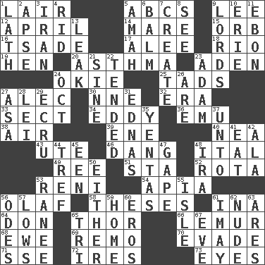 ACROSS 1. Den 5. Lettered men learn these first 9. Area sheltered from the wind 12. Showery time 14. Female horse 15. Globe 16. Sadhe (variant) 17. Toward shelter 18. River (Sp.) 19. Layer 20. Respiratory problem 23. Arabian gulf 24. Migrant worker of the '30s 25. Small amounts or degrees 27. Actor Baldwin 30. Compass dir. 32. Period 33. Religious group 34. Whirlpool 36. Australian flightless bird 38. Wind 39. Compass dir. 40. Teachers' org. 43. Shoshoni 46. Mild oath, euphamism for damn 48. Slanted text style (abbr.) 49. Portuguese money of account (variant) 51. R.R. building 52. Round or rotation of duties 53. Painter Guido (1575-1642) 54. Capital of Western Samoa 56. Norwegian king 58. College papers 61. _ tizzy (2 wds.) 64. Spanish title 65. Son of Odin 66. Arboreal primate 68. She-sheep 69. San ____ (Riviera town) 70. Elude 71. Compass dir. 72. Angers 73. Sight organs DOWN 1. Thin strip of wood or metal 2. Domed church section 3. SW Asia republic 4. To free from 5. Wet nurse 6. Lip ointment 7. Make 8. Observe 9. Nobles 10. One of the Great Lakes 11. Inky black, to poets 13. Path through which fluid escapes 21. Trig term 22. Watched over 23. First man 24. Sep. follower 26. "We ___ not amused" (Victoria) 27. White ___ sheet 28. Luau accessory 29. Shade of tan 31. Ferber et al. 35. Gossips 37. To (old English) 41. Consume 42. According to 44. Unclean, religiously 45. Car or cant ending 47. Yawn 48. Lyricist Gershwin 50. One or the other 53. The wife of a rajah (variant) 55. Small island 56. Lyric poems 57. Moos 59. Dwelling 60. Greek god of love 61. "If ____ say so..." 62. Naked 63. Ancient Greek god of war 65. Three (prefix) 67. First lady