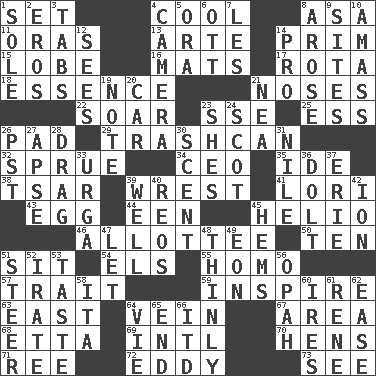 ACROSS 1. Put into a specified state 4. Calm and collected 8. White ___ sheet 11. Mouths or openings 13. Johnson of "Laugh-In" 14. Demure 15. Ear part 16. Floor coverings 17. Round or rotation of duties 18. Substance 21. Olfactory organs 22. Fly high 23. Compass dir. 25. Curvy letter 26. Writing tablet 29. File 13 32. Upset 34. Corporate head (abbr.) 35. Binary compound 38. Russian ruler of old 39. Take or capture by force 41. Australian parrot (variant) 43. Oval reproductive body of a fowl 44. Car or cant ending 45. Sun: prefix 46. One to whom something is allotted 50. "___ Little Indians" 51. Be seated 54. Raised railways 55. Same (prefix) 57. Distinguishing feature 59. Heighten or intensify 63. 90 degrees 64. Distinctive style or manner 67. Type of rug 68. Singer James 69. International (abbr.) 70. Coop moms 71. To separate or throw off 72. Whirlpool 73. Perceive with the eye DOWN 1. Not divided or shared with others 2. Greek god of love 3. Bar bills 4. Device for capturing images 5. Mouth or opening 6. Baseball player Mel 7. French article 8. Came up 9. Settings 10. Collect or gather 12. Perceives with the eye 14. Adept person 19. Brief written record 20. Automobile 21. Teachers' org. 23. "______ My Girl" (Turtles hit) 24. Native of Scotland 26. Pacific Standard Time (abbr.) 27. Domed church section 28. To draw with force 30. Odor 31. The longest river in the world 33. Capital and largest city of Mongolia 36. Stupid person 37. 4th largest of the Great Lakes 39. Water source 40. Vintage cars 42. Electrically charged atom 45. Equivocates 47. Allow 48. Without viscosity 49. A really long time 51. Bull 52. Feeling or showing extreme anger 53. Clothes sense 56. Brightly colored fish 58. Call ___ day 60. Angers 61. French philosopher Descartes 62. Relaxation 64. Compete 65. Conclude 66. It would