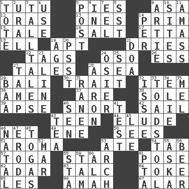 ACROSS 1. Ballerina skirt 5. Sliced desserts 9. White ___ sheet 12. Mouths or openings 13. Washington bills 14. Demure 15. Lie 16. Table seasoning 17. Singer James 18. Pipe bend 19. Fitting 21. Frees from moisture 22. Labels 24. Bear (Spanish) 26. Double-curved letter 27. Falsehoods 28. At sea 29. Indonesian resort city 30. Distinguishing feature 32. A distinct part 36. So be it 37. "We ___ not amused" (Victoria) 38. Flatfish 39. Domed church section 40. Derisive sound 42. Move on water 43. Adolescent 44. Evade 46. Remaining after all deductions 49. Compass dir. 50. Observes 51. Scent 53. Had dinner 54. Bar bill 57. Ancient Roman robe 58. Play the lead 61. Introduce or present, as a question 62. The sixth month of the Jewish calendar 63. Baby powder 64. Casino tip 65. French article 66. Nanny 67. Having or resembling wings DOWN 1. Carry 2. Mountain range 3. Baron Munchausen's specialties 4. Purpose 5. Mail 6. _ tizzy (2 wds.) 7. Snakelike fish 8. Fast jet (abbr.) 9. Nick name for Arthur 10. Locates 11. Collect or gather 14. For each 19. Ripen 20. Inconspicuous attention getter 21. ___ good deed 23. Place in a line 24. Flexible twig of a willow tree 25. Put into a specified state 27. Pack (down) 28. Composer Copland 29. Sound made by sheep 31. Indian princess (variant) 32. Come out of 33. Inedible or poisonous agaric 34. Writer Wiesel 35. Cartoonist voice _ Blanc 40. Elected rep. 41. Trial 43. Beverage made from leaves 45. Area sheltered from the wind 46. Relating to or accompanying birth 47. Eat (away) 48. Ancient Roman robes 52. Third mo. 53. Bowlike part 55. "____ silly question..." 56. Fermented drink made from hops 58. R.R. building 59. Scottish cap 60. Wing 61. Parent Teacher Association (abbr.)