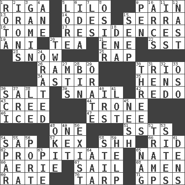ACROSS 1. Port city in Latvia 5. _ and Stitch 9. Ache 13. NW Algerian seaport 14. Lyric poems 15. Spanish missionary in California 16. Heavy book 17. Homes 19. Cuckoo 20. Afternoon social gathering 21. Compass dir. 22. Fast jet (abbr.) 23. Frozen precipitation 25. Reproach for some lapse or misdeed 26. Role for Stallone 30. Musical group of three 34. Moving or stirring 35. Coop moms 36. Table seasoning 39. Slow-paced one 42. Make new 43. Algonquian 44. Marketplace scale 46. On the rocks 47. First name in cosmetics 48. Single 51. Fast planes 54. Plant excrement 57. Dry husk or covering 58. Quiet! 60. To free from 62. Conciliate 65. Nathan's nickname 66. Nest on high 67. Travel by water 68. So be it 69. Pace 70. Canvas cover 71. Global Positioning Systems (abbr.) DOWN 1. Round or rotation of duties 2. Metal shackles 3. Homeless child 4. A saturated hydrocarbon 5. Old wives' tales, e.g. 6. The main thing one is thinking about 7. French article 8. Flexible twig of a willow tree 9. Animal enclosure 10. Curves 11. Angers 12. Political cartoonist Thomas 15. Ooze 18. Heredity factor (abbr.) 20. It was, poetically 24. Declaimed 27. Mountains (abbr.) 28. Storage container 29. Speak pompously 30. Triplets 31. To sift 32. Indiana (abbr.) 33. Bear (Spanish) 36. _-fi 37. Curve 38. Area sheltered from the wind 40. Big collection agency 41. Car dealer's back yard 45. Delicate 48. Migrant worker of the '30s 49. Fish or hair follower 50. Be 52. _____ steamer (cargo ship) 53. Settings 54. Practice fight 55. Length times width 56. Left side of a ship or aircraft 58. Use a swizzle stick 59. Aid 61. Hiding places for outlaws 63. Sliced dessert 64. American Automobile Association (abbr.) 65. Tired old horse