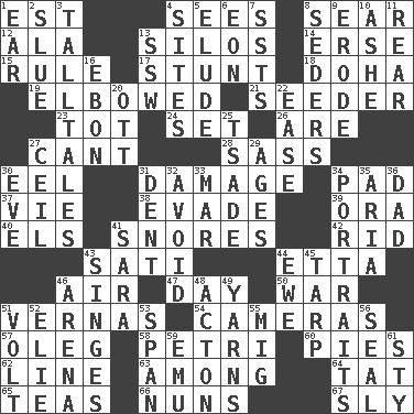 ACROSS 1. Eastern Standard Time (abbr.) 4. Perceives with the eye 8. Singe 12. Chicken ___ king 13. Grain storage towers 14. Celtic language 15. General guideline 17. Difficult or unusual or dangerous feat 18. Capital of the state of Qatar 19. Shoved, as through a crowd 21. Sowing specialist 23. Small child 24. Arrange properly for use 26. "We ___ not amused" (Victoria) 27. Patter 28. Backtalk 30. Snakelike fish 31. Break 34. Groovy apt. 37. Compete 38. Dodge 39. Mouth or opening 40. Raised railways 41. Sounds asleep 42. To free from 43. Suttee (variant) 44. Singer James 46. Atmosphere 47. 24 hours 50. Armed conflict 51. Actresses Bloom and Felton 54. Devices for capturing images 57. Cassini of fashion 58. _ dish (used to culture cells) 60. Sliced desserts 62. Actor's bit 63. Amid 64. Make lace 65. Beverages made from leaves 66. Religious women 67. Playfully artful DOWN 1. Hearing organ 2. Turn sharply 3. Baron Munchausen's specialties 4. Settings 5. Evade 6. Period of immesurable duration 7. Fast planes 8. Spring feasts 9. Wear away 10. American tennis player Robert 11. Tail end 13. Compass dir. 16. Inky black, to poets 20. Baseball player Mel 22. Relaxation 25. Sadhe (variant) 27. To provide with a ceiling 29. Matures 30. Night before a holiday 31. Undesirable depression on a surface 32. Shun 33. Make imperfect 34. Likenesses of persons 35. Operatic vocal solo 36. Male parent 41. "Two Mules for Sister ____" 43. Scorches 44. She-sheep 45. Canvas cover 46. Sports stadium 48. 13-14th century defensive garment 49. Tall tales 51. Electrical Unit 52. Writer Wiesel 53. Connect, as a bridge 55. Russian fighter aircraft 56. Lick closed 59. Australian flightless bird 61. Filthy place