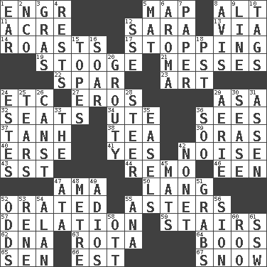 ACROSS 1. Engineer (abbr.) 5. Atlas unit 8. The first octave above the treble staff 11. Land measure 12. "Two Mules for Sister ____" 13. By way of 14. Cooks with dry heat, as in an oven 17. Discontinuing 19. Moe Howard, for one 21. Makes clutter 22. Coast Guard woman 23. Tate display 24. And so on (abbr.) 27. Greek god of love 29. White ___ sheet 32. Theater features 34. Shoshoni 36. Perceives with the eye 37. Hyperbolic tangent 38. Afternoon social gathering 39. Mouths or openings 40. Celtic language 41. Consenting reply 42. Annoying sound 43. Fast jet (abbr.) 44. San ____ (Riviera town) 46. Car or cant ending 47. Wet nurse (var.) 50. Austrian-born American filmmaker Fritz 52. Spoke pompously 55. Michaelmas daisies 57. Conveyance 59. Flight of steps 62. Heredity factor (abbr.) 63. Roll call or roster of names 64. Expressions of contempt or scorn 65. Elected rep. 66. Eastern Standard Time (abbr.) 67. Frozen precipitation DOWN 1. Ewer handle 2. Non-commissioned officer (abbr.) 3. Pate de foie ____ 4. Musical pauses 5. Floor covering 6. Scent 7. Some stationery 8. Deliberation 9. Actor's bit 10. Labels 12. Compass dir. 15. Drinks excessively 16. Fly high 18. Pacific Standard Time (abbr.) 20. Sulky 24. _____ Park, CO 25. Pulls into pieces 26. 2nd pers. sing. pres. of can (arch.) 28. Bull 29. Nest on high 30. Gospel singer Marvin 31. NE Netherlands city 33. Definite Article 35. Artist's stands 36. "Barney Miller" actor Jack 42. Music written for nine 45. Floor protectors 47. _ moment's notice (2 wds.) 48. Distance measurement (Brit.) 49. Goodbye (Sp.) 51. Seizes 52. Probability 53. French philosopher Descartes 54. Actor Alda or Thicke 55. Santa ___, CA 56. The Jewish people; Israel 58. Baseball player Mel 60. Friend of Pooh 61. Compass dir.