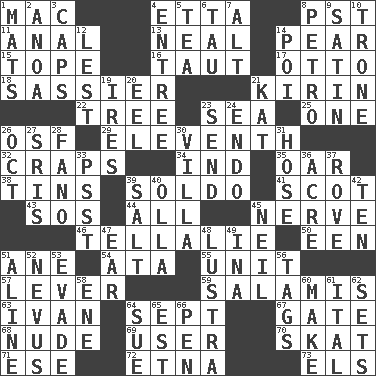 ACROSS 1. Big _ 4. Singer James 8. Pacific Standard Time (abbr.) 11. Of or related to the anus 13. Be tempered by heat 14. Lightbulb-shaped fruit 15. Drink excessively 16. Tense 17. "Beetle Bailey" pooch 18. More disrespectful 21. Japanese brewing company 22. Family _ (genealogy) 23. Ocean 25. Single 26. Order of Saint Francis (abbr.) 29. Veterans Day date 32. Dice game 34. Working for oneself (abbr.) 35. Rowing implement 38. Metal containers 39. Twentieth part of a lira 41. Highlander 43. Distress signal 44. 100% 45. Boldness 46. Copy Pinocchio 50. Car or cant ending 51. One (Scot) 54. "One Day ___ Time" 55. A single undivided whole 57. Crowbar 59. Deli grouping 63. _ the terrible 64. Back-to-school mo. 67. Yard entry 68. Unadorned 69. One who uses or employs something 70. Three-handed card game 71. Compass dir. 72. Inactive volcano in Sicily 73. Raised railways DOWN 1. Floor coverings 2. Small Philippine buffalo 3. Balmoral and tarboosh 4. Main course 5. Beverage made from leaves 6. The 19th letter of the Greek alphabet 7. Keyboard modifier key 8. Stone: prefix 9. Smooth fabric 10. Heavy duty weighing machine 12. For fear that 14. Luau course 19. Angers 20. Snakelike fish 21. Krazy ___ of comics 23. Transmit 24. Inside; within (prefix) 26. Sep. follower 27. Indian titles of respect 28. Papal veil 30. Country estate 31. Flexible conduit 33. Inconspicuous attention getter 36. 43,560 square feet 37. Be footloose 39. Table seasoning 40. Spanish pot 42. Nine, plus one 45. Famous astronaut Armstrong 47. Ewer handle 48. A period of five years 49. _ tizzy (2 wds.) 51. Place in a line 52. Mole, birthmark 53. Elude 56. Labels 58. Compass dir. 60. Create 61. Slanted text style (abbr.) 62. Puts into a specified state 64. Institute legal proceedings 65. Eastern Standard Time (abbr.) 66. Writing instrument