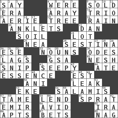 ACROSS 1. Declare 4. We are 8. Exchanged or delivered for money 12. Epoch 13. Like ___ of sunshine 14. Musical group of three 15. Nest on high 18. Relationship diagram 19. Precipitation 20. Short socks 22. Daniel's nick name 23. Earth 24. Car dealer's back yard 25. Teachers' org. 26. French poetic form 30. Compass dir. 33. Parts of speech 36. Lyric poems 37. Falls behind 39. Girls' org. (abbr.) 40. Soft 41. Clip 42. Oozy 44. Had dinner 45. Gist 47. Eastern Standard Time (abbr.) 50. Black tropical American cuckoo 51. Path through which fluid escapes 53. Supplement with great effort 54. Deli grouping 57. Not wild 59. Grant temporary use of 61. Small fatty European fish 63. Independent ruler or chieftain 64. Enthusiastic 65. Retirement account (abbr.) 66. Flats, for short 67. Wagers 68. Tired old horse DOWN 1. Ocean 2. Length times width 3. Tall tales 4. Electrical Unit 5. Blunders 6. Actress Charlotte 7. Sight organ 8. Ski resort town in Vermont 9. NW Algerian seaport 10. Cards in a Roman deck? 11. Spanish title 16. Picture 17. Writer Wiesel 21. Flair 22. Two (Sp.) 24. French article 26. Fastener 27. The content of cognition 28. A home for chicks 29. American tennis player Robert 30. Otherwise 31. Without 32. The front part of a cuirass 34. Double curve, resembling the letter S 35. Purpose 38. Orators 42. _-fi 43. Shout 46. Compass dir. 48. Oceans 49. Pack (down) 52. Japanese brewing company 53. Send forth 54. In a ____ (agitated or irritated) 55. Sums up 56. "Two Mules for Sister ____" 57. Afternoon social gathering 58. Electrical Unit 59. Experiment locale 60. Night before a holiday 62. Label