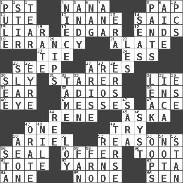 ACROSS 1. Pacific Standard Time (abbr.) 4. Nanny 8. Infant food 11. Shoshoni 12. Silly 14. Ketch in the Levant 15. One who doesn't tell the truth 17. _ Allan Poe 18. Extremities 19. Tendancy to err 21. Having winglike extensions 23. Standoff 24. Curvy letter 25. Ooze 27. Ancient Greek god of war 30. Wily 31. A viewer who gazes fixedly 34. Untruth 37. Ewer handle 38. Goodbye (Sp.) 39. Followers of ems 40. Sight organ 41. Makes clutter 43. Adept person 44. French philosopher Descartes 45. "____ silly question..." 47. Single 49. Attempt 50. Satellite of Uranus 52. Thinks logically 56. Lick closed 57. Auction bid 60. A blast of a horn 61. Haul 62. Tall tales 63. Parent Teacher Association (abbr.) 64. One (Scot) 65. Thickened enlargement 66. Elected rep. DOWN 1. Whimper 2. Use a spoon 3. Separate forcefully 4. Sibling's daughter 5. Actor Griffith 6. Tired old horse 7. Santa ___, CA 8. Leg coverings 9. Assistant 10. Personal Computers (abbr.) 13. Period 14. Oceans 16. Pace 20. Cuts off 22. French article 25. Kill 26. Jane of fiction 27. Ascend 28. Vintage cars 29. Celtic language 30. Observe 32. Docile 33. Arabian gulf 34. Path through which fluid escapes 35. South American Indian 36. Compass dir. 42. "Two Mules for Sister ____" 44. Portuguese money of account (variant) 46. System (abbr.) 47. Declaim 48. The longest river in the world 49. Laconic 50. Period of immesurable duration 51. Myrna of the movies 52. Tear apart 53. I made a mistake 54. Make mention of 55. Comedian Laurel of Laurel & Hardy 56. R.R. building 58. Air blower 59. From