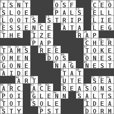 ACROSS 1. Is not 5. Order of Saint Francis (abbr.) 8. Corporate head (abbr.) 11. _ gin 12. Friends 14. Pipe bend 15. Plunders 17. Empty completely 18. Falsehood 19. Core 21. _ moment's notice (2 wds.) 22. Part of a journey 23. Definite Article 24. Ending with capital 25. Strike 27. Infant food 28. "Mermaids" star 31. Scottish caps 35. To separate or throw off 37. Puff or smoke 38. Presage 39. Two (Sp.) 41. Washington bills 42. Went 43. Tired old horse 45. A home for chicks 46. Helper 47. Make lace 49. Tate display 51. Shoshoni 52. Ocean 55. Curve 57. Adept person 60. Thinks logically 62. Luau course 63. American astronaut and politician John 65. Table seasonings 66. Small child 67. Flatfish 68. It may be bright or harebrained 69. Filthy place 70. Pacific Standard Time (abbr.) 71. Dormintory (informal) DOWN 1. Small island 2. Agitate, as a liquid 3. Trap for birds or small mammals 4. Wig 5. Elect 6. "Two Mules for Sister ____" 7. Sudden quick movement 8. Portable communications device 9. Writer Wiesel 10. Cassini of fashion 13. Practice fight 16. Clip 17. Oozed 20. Russian ruler of old 26. Gambison 29. Supplements with great effort 30. Relief 31. Ancient Roman robe 32. Mine, in Marseilles 33. Ananias' fault 34. Contemptuous expression 36. Period of immesurable duration 40. Titan orbits this 44. Yard entry 48. Beverages made from leaves 50. Labels 52. Twentieth part of a lira 53. Keyboard key 54. Indian state 55. Flats, for short 56. Carrot, for example 58. Hoof sound 59. Snakelike fish 61. Expressed in words 64. Remaining after all deductions