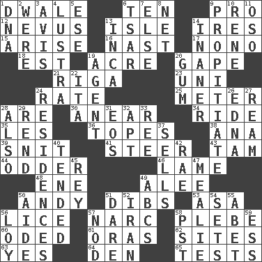 ACROSS 1. A sleeping potion; an opiate (poet.) 6. "___ Little Indians" 9. Adept person 12. Mole, birthmark 13. Capri or Wight 14. Angers 15. Originate 16. Political cartoonist Thomas 17. Words to Nanette 18. Eastern Standard Time (abbr.) 19. Land measure 20. Yawn 21. Capital of Latvia 23. Single; one (prefix) 24. Assign a rank or rating to 25. Distance measurement 28. "We ___ not amused" (Victoria) 30. Approach 34. Travel on an animal 35. French article 36. Drinks excessively 38. Santa ___, CA 39. In a ____ (agitated or irritated) 41. Bull 43. Scottish cap 44. More peculiar 46. Unable to walk 48. Compass dir. 49. Toward shelter 50. "60 Minutes" Commentator Rooney 51. Rights 53. White ___ sheet 56. Louse (plural) 57. Drug cop 58. Cadet 60. Wrote a lyric poem 61. Mouths or openings 62. Locates 63. It is so 64. Lair 65. Trials DOWN 1. Heredity factor (abbr.) 2. Past tense of be (plural) 3. Advice 4. A period of five years 5. Compass dir. 6. Russian ruler of old 7. Otherwise 8. Fish or hair follower 9. Appease 10. French philosopher Descartes 11. Bear (Spanish) 13. South American Indian 14. More empty; more void 19. Representative 20. Chewing product 22. Call ___ day 24. Homes 26. Pulitzer Prize-winning author Ferber 27. 480, 500 or 516 sheets of paper 28. In addition 29. Tear apart 31. Greek goddess of the dawn 32. Fitting 33. To sift 37. Exchanges for money 40. Watched over 42. Actress Charlotte 45. Marina Del _, California 47. Ear of corn 49. Lettered men learn these first 50. Assistant 51. Have the gumption 52. SW Asia republic 54. Arranges properly for use 55. Collude with 56. Myrna of the movies 57. Dreamland 58. Pacific Standard Time (abbr.) 59. Double-curved letter