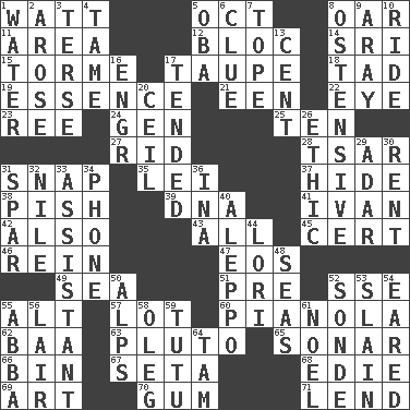 ACROSS 1. Electrical Unit 5. Sep. follower 8. Rowing implement 11. Length times width 12. Coalition 14. _ Lanka 15. Singer Mel 17. Grayish beige 18. Bit 19. Center 21. Car or cant ending 22. Sight organ 23. To riddle 24. Commissioned mil. rank 25. Nine, plus one 27. To free from 28. Russian ruler of old 31. Fastener 35. Luau accessory 37. Flintstone garb 38. Expression of disdain 39. Heredity factor (abbr.) 41. "Terrible" tsar 42. In addition 43. Everything 45. Sure thing 46. It's straight from the horse's mouth 47. Greek goddess of the dawn 49. Ocean 51. Before (prefix) 52. Compass dir. 55. Keyboard modifier key 57. Car dealer's back yard 60. Player piano 62. Sound made by sheep 63. Mickey's pet 65. Echolocation 66. Storage container 67. Bristle 68. Singer Brickell 69. Tate display 70. Chewing product 71. Grant temporary use of DOWN 1. Wetness 2. Came up 3. Laconic 4. Not wild 5. Chief or king in Benin or Nigeria 6. A slight indication 7. Drink excessively 8. Clearly or manifestly demonstrative 9. Like ___ of sunshine 10. Travel on or in a vehicle 13. Penny 16. Engineer (abbr.) 17. Watched over 20. To provide with a ceiling 26. Principle of right and wrong 29. The sixth month of the Jewish calendar 30. Monthly bill 31. Practice fight 32. "Death on the ____" 33. Helper 34. Give a jingle 36. _ tizzy (2 wds.) 40. City in Syria 44. Australian parrot (variant) 48. Oceans 50. High mountains 52. Message 53. Killed 54. Having ears or earlike features 55. Swedish rock group 56. Den 58. Cassini of fashion 59. Ballerina skirt 61. Christmas carol 64. Scottish cap