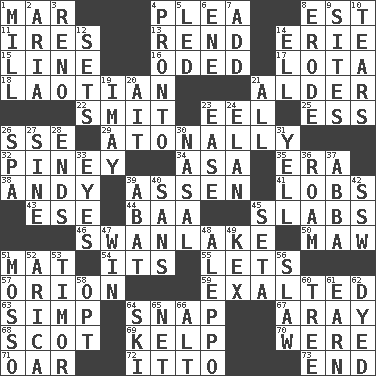 ACROSS 1. Spoil 4. Entreaty 8. Eastern Standard Time (abbr.) 11. Angers 13. Tear apart 14. 4th largest of the Great Lakes 15. Actor's bit 16. Wrote a lyric poem 17. Globular water bottle used in Asia 18. Of or relating to Laos or its people 21. Tree or shrub in the Birch family 22. Stricken, poetically 23. Snakelike fish 25. Curvy letter 26. Compass dir. 29. Lacking a tonal center or key 32. Abounding in pines 34. White ___ sheet 35. Period 38. Actor Griffith 39. NE Netherlands city 41. Tennis shots 43. Compass dir. 44. Sound made by sheep 45. Broad, flat, thick pieces 46. Tchaikovsky ballet 50. Informal term for the mouth 51. Floor protector 54. It is 55. Allows 57. Greek mythologigal hunter 59. Honored 63. Simple or foolish person 64. Fastener 67. Like ___ of sunshine 68. Native of Scotland 69. Seaweed 70. We are 71. Boat paddle 72. "Tell ____ the Marines!" 73. Conclusion DOWN 1. Place where flour is made 2. Roberta Peters solo 3. Former U.S. Attorney General Janet 4. Right away 5. Directed 6. Compass dir. 7. Find the sum of 8. Eat (away) 9. Settings 10. Pulls apart 12. Arranges properly for use 14. Pipe bend 19. "If ____ say so..." 20. Small island 21. 100% 23. Relaxation 24. Enthusiasm 26. Health resort 27. Trig term 28. Conclusions 30. Rhinal 31. Shout 33. Snake ____ (dice throw) 36. Wander aimlessly 37. Swedish rock group 39. Blind as ____ 40. Without 42. Compass dir. 45. Stalk of a moss capsule 47. Victory 48. City in Syria 49. A weed 51. With motion or animation 52. N. Chile seaport 53. Southeast Indonesia island 56. Cole _ (cabbage dish) 58. Elect 60. Family _ (genealogy) 61. Merit 62. Colored 64. What Jean-Claude Killy likes to do 65. Fish or hair follower 66. The first octave above the treble staff