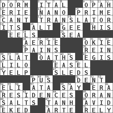ACROSS 1. Dormintory (informal) 5. Slanted text style (abbr.) 9. Brightly colored fish 13. One of the Great Lakes 14. Billionth: prefix 15. A-one 16. Patter 17. Interpreter 19. It is 20. Keyboard modifier key 21. Turn to the right 22. Part of HMS, perhaps 23. Snakelike fish 25. Ocean 26. Nest on high 30. Migrant worker of the '30s 34. Aches 35. It's straight from the horse's mouth 36. Narrow board 39. Curses 42. Armor plate that protects the chest 43. _ and Stitch 44. Artist's stand 46. Sharp bark 47. Bobsleighs 48. Fluid product of inflammation 51. Undesirable depression on a surface 54. Connecticut Ivy Leaguer 57. "One Day ___ Time" 58. Declare 60. Epoch 62. Homes 65. Northwest Algerian city 66. Table seasonings 67. Hyperbolic tangent 68. Enthusiastic 69. Made supply last 70. Johnson of "Laugh-In" 71. Trust DOWN 1. Tenth: prefix 2. Speak pompously 3. Remove soap 4. Was introduced to 5. International (abbr.) 6. Small pie 7. Santa ___, CA 8. Yearns 9. Mouth or opening 10. Heart or essence 11. Mine, in Marseilles 12. Possessive pronoun 15. Entreaty 18. Observe 20. At sea 24. Portable computer 27. _ de Janeiro 28. _ tizzy (2 wds.) 29. _____ Park, CO 30. Threatening words 31. Barrel 32. One more than two 33. Followers of ems 36. Stealthy 37. Untruth 38. 100% 40. Actor Linden 41. Compass dir. 45. Whirlpool 48. Writing tablets 49. Shoshoni 50. Before Barbara or Clara 52. Boldness 53. Get behind 54. Celtic language 55. Path through which fluid escapes 56. Small island 58. Posted 59. American tennis player Robert 61. "60 Minutes" Commentator Rooney 63. It would 64. Auto 65. Boat paddle
