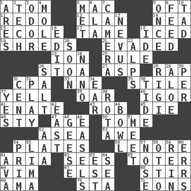 ACROSS 1. Smallest unit of an element 5. Apple computer (short form) 8. Often (poetically) 11. Do over again 12. Enthusiasm 14. Teachers' org. 15. Learning spot: Fr. 17. Not wild 18. On the rocks 19. Tears up 21. Eluded 23. Electrically charged atom 25. Governing power 26. Portico 27. Viper 28. Hit sharply and swiftly 31. Accounting whiz (abbr.) 33. Compass dir. 35. Vertical member of a panel or frame 37. Shout 38. Rowing implement 40. Composer Stravinsky 41. Maternal 43. Director Reiner 45. Expire 46. Filthy place 47. Mature 50. Heavy book 52. At sea 53. Deep reverence 54. Food holders 56. Poe poem 61. Operatic vocal solo 62. Observes 65. Carrier 66. Zeal 67. Otherwise 68. Commotion 69. Housemaid (var.) 70. R.R. building 71. Immeasurably long periods of time DOWN 1. Ancient Greek god of war 2. Technical work 3. Aroma 4. Undercover agent 5. Was introduced to 6. Insect wing 7. Device for capturing images 8. Single time 9. Nourish 10. Small amount or degree 13. Congenital growth or mark on the skin 16. Prepare for publication 18. Binary compound 20. Within a short period 22. High mountains 24. Billionth: prefix 26. Table seasoning 28. Swiss mountan, "Queen of the Mountains" 29. Medicinal plant 30. For each 31. Penny 32. Shaw product 34. Hearing organ 36. Periodic rise and fall of the sea level 37. Consenting reply 39. Roll call or roster of names 42. Compass direction 44. Soup holder 48. Honkers 49. Artist's stands 51. Confront 52. Auto club (abbr.) 54. Demure 55. Pale green bean 57. Sense of smell 58. "Beetle Bailey" pooch 59. It's straight from the horse's mouth 60. Blunders 61. Actress Gardner 63. Eastern Standard Time (abbr.) 64. Ocean