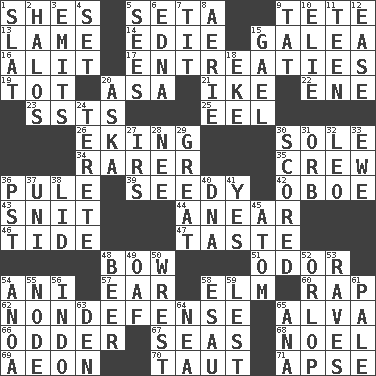 ACROSS 1. "______ My Girl" (Turtles hit) 5. Bristle 9. Wig 13. Unable to walk 14. Singer Brickell 15. An organ shaped like a helmet 16. Came down and settled, as after flight 17. Pleas 19. Small child 20. White ___ sheet 21. Eisenhower's nickname 22. Compass dir. 23. Fast planes 25. Snakelike fish 26. Supplementing with great effort 30. Not divided or shared with others 34. More uncommon 35. Ship's personnel 36. Whimper 39. Shabby and untidy 42. Mitch Miller's instrument 43. In a ____ (agitated or irritated) 44. Approach 46. Event that recurs at intervals 47. Clothes sense 48. Arrow shooter 51. Scent 54. Cuckoo 57. Hearing organ 58. Shade tree 60. Reproach for some lapse or misdeed 62. Unrelated to defense, as in spending 65. Inventor's middle name 66. More peculiar 67. Oceans 68. Christmas carol 69. Period of immesurable duration 70. Tense 71. Domed church section DOWN 1. Narrow board 2. Saint headwear 3. Gives off 4. Put into a specified state 5. Perceives with the eye 6. Pulitzer Prize-winning author Ferber 7. Teat (slang) 8. Nest on high 9. Make lace 10. Writer Wiesel 11. Adolescent 12. Comfort 15. Highlander 18. Make supply last 20. "____ silly question..." 24. Cylindrical with tapered ends 27. Big collection agency 28. Born 29. Relatively large 30. Tallied 31. Globe 32. Lion 33. She-sheep 36. Pacific Standard Time (abbr.) 37. Single; one (prefix) 38. Hat (slang) 40. Heredity factor (abbr.) 41. Affirmative reply 45. Smallest unit of an element 48. Fermented drink made from hops 49. Clumsy lout 50. Take or capture by force 52. Lowest deck of a ship 53. All-night dance parties 54. Small Philippine buffalo 55. Connecting point 56. Southeast Asian peninsula 58. He sold his birthright 59. For fear that 61. Light colored 63. Lair 64. Teachers' org. 65. Santa ___, CA