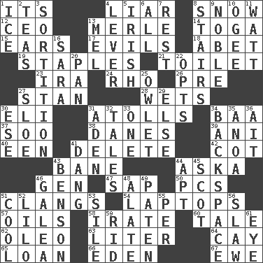 ACROSS 1. ___ a Wonderful Life 4. One who doesn't tell the truth 8. Overwhelm 12. Corporate head (abbr.) 13. Haggard of country music 14. Ancient Roman robe 15. Hearing organs 17. Vices 18. Collude with 19. Paper fasteners 21. Bathroom plumbing fixture 23. Lyricist Gershwin 24. 17th letter of the Greek alphabet 26. Before (prefix) 27. Comedian Laurel of Laurel & Hardy 28. Soaks 30. Biblical high priest 31. Ringlike coral islands and reefs 34. Sound made by sheep 37. "Barney Miller" actor Jack 38. Natives or inhabitants of Denmark 39. Cuckoo 40. Car or cant ending 41. Keyboard key 42. Small bed 43. Object of repulsion 44. "____ silly question..." 46. Commissioned military rank (abbr.) 47. Plant excrement 50. Personal Computers (abbr.) 51. Gives out a loud, resonant sound 54. Portable computers 57. Lubricates 58. Feeling or showing extreme anger 60. Story 62. Margarine 63. 61 cubic inches 64. Island 65. Grant temporary use of 66. Paradise 67. She-sheep DOWN 1. Frozen water 2. Beverages made from leaves 3. Making a chance decision by using lots 4. Prying instrument 5. From or relating to Ireland 6. 100% 7. Remainder 8. Flight of steps 9. Having high moral qualities 10. Double curve, resembling the letter S 11. Electrical Unit 13. Cartoonist voice _ Blanc 16. "Two Mules for Sister ____" 20. Baking dish 22. Elects 25. A small or young owl 27. _ gin 29. Otherwise 30. Compass dir. 31. An important port of Yemen 32. Lies 33. Single 34. Keyboard key 35. Small Philippine buffalo 36. Small island 41. Mild oath, euphamism for damn 43. Gillaume's butler role 44. Fitting 45. Native of Scotland 46. An organ shaped like a helmet 48. Having winglike extensions 49. Eucharist need 51. Calm and collected 52. _ and Stitch 53. Drop; flow; fall 55. For each 56. Cole _ (cabbage dish) 59. To free from 61. Sight organ