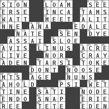 ACROSS 1. The Jewish people; Israel 5. Rich soil 9. Observe 12. Celtic language 13. South American Indian 14. Scottish caps 15. Electrical Unit 16. Confront 17. Set down 18. Compass dir. 19. Santa ___, CA 21. Peak District village in England 22. Nathan's nickname 24. Elected rep. 26. Color 27. Slender Brazilian palm 28. _ gin 29. Advice 30. "_ and Lucy" (Charlie Brown theme song) 32. 1/640 square mile 36. Moving, as bait 37. And not 38. Supercomputer manufacturer 39. Arabian gulf 40. Tarsus (plural) 42. Casino tip 43. Do not 44. Trap for birds or small mammals 46. Mountains (abbr.) 49. Personal question 50. Religious women 51. Hold, grip (Informal) 53. 23rd letter of the Greek alphabet 54. Soggy 57. Prong on a fork 58. Suttee (variant) 61. Connecting point 62. Inside; within (prefix) 63. Fastener 64. One of the Great Lakes 65. Portuguese money of account (variant) 66. False hair 67. Locale of original sin DOWN 1. Stitched 2. SW Asia republic 3. Clearly or manifestly demonstrative 4. Remaining after all deductions 5. Pale green bean 6. Single 7. Adept person 8. Floor covering 9. First course 10. Poet Dickinson 11. First name in cosmetics 14. Small boy 19. _ moment's notice (2 wds.) 20. Famous astronaut Armstrong 21. Compass dir. 23. NE Netherlands city 24. Runs notes together 25. Greek goddess of the dawn 27. Enthusiastic 28. Derisive sound 29. According to 31. Empty; void 32. 13-14th century defensive garment 33. What you're doing now 34. Immoral or dissolute person 35. Sight organ 40. Coat; cloak 41. Lodging establishments 43. Male parent 45. Fr. "Yes" 46. Mother 47. One or ones belonging to thee 48. Message 52. Lion 53. Corncob 55. Singer Brickell 56. Adolescent 58. Fast jet (abbr.) 59. One (Scot) 60. Make lace 61. Born
