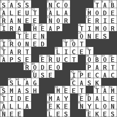 ACROSS 1. Backtalk 5. Non-commissioned officer (abbr.) 8. Bar bill 11. Eskimo relative 13. Chicken ___ king 14. Method 15. Indian princess (variant) 16. Not either 17. 4th largest of the Great Lakes 18. Lyricist Gershwin 19. Pile 21. Southeast Indonesia island 22. Adolescent 24. Singles 25. Pressed 27. Small child 29. Small pie 30. It is permitted: Lat. 32. Domed church section 33. Spew [out] 35. Mitch Miller's instrument 39. Cowboy competition 41. Piece 42. Purpose 43. Medicinal drug used to evoke vomiting 45. Volcanic refuse 48. Keg 49. Box-office sellout 50. Rendezvous 52. Scottish cap 55. Periodic rise and fall of the sea level 56. Can I? 57. Peak District village in England 59. Silent film actress Nazimova 60. Make supply last 61. Thermoplastic polyamide 62. Born 63. French article 64. Supplements with great effort DOWN 1. Indian skirt 2. Having or resembling wings 3. Elected representatives 4. Institute legal proceedings 5. Nanny 6. Hoof sound 7. Boat paddle 8. Singer Mel 9. Goodbye (Sp.) 10. Fermented drink made from hops 12. Giggle 14. Chow _ 20. Conclusion 21. Haul 23. Keyboard key 25. Call ___ day 26. Strike 27. Nervous spasm 28. Sep. follower 30. Nilotic language 31. Drinks excessively 33. Begley and Asner 34. To separate or throw off 36. Sass 37. Mouth or opening 38. And so on (abbr.) 40. Ending for "Through" and "Enough" 43. Frozen water 44. Eucharist need 45. Grin 46. Dipping utensil 47. At sea 49. Comedian Laurel of Laurel & Hardy 50. Create 51. Snake ____ (dice throw) 53. Medicinal plant 54. Not women's 56. Cartoonist voice _ Blanc 58. Color