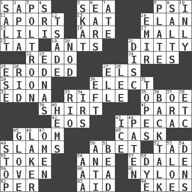 ACROSS 1. Plant excrements 5. Ocean 8. Air pressure measure (abbr.) 11. To the left, to Queeg 13. Krazy ___ of comics 14. Enthusiasm 15. Ms. Damita and namesakes 16. "We ___ not amused" (Victoria) 17. Promenade 18. Make lace 19. Pismires 21. Simple song 22. Redecorate 24. Angers 25. Eaten away 27. Raised railways 29. The Jewish people; Israel 30. Choose 32. Pulitzer Prize-winning author Ferber 33. Firearm 35. Mitch Miller's instrument 39. Chest covering 41. Component 42. Greek goddess of the dawn 43. Medicinal drug used to evoke vomiting 45. Take by theft 48. Keg 49. Shuts with force 50. Collude with 52. Small amount or degree 55. Puff or smoke 56. A saturated hydrocarbon 57. Peak District village in England 59. Baking chamber 60. "One Day ___ Time" 61. High-strength synthetic material 62. For each 63. Assist 64. Supplements with great effort DOWN 1. Table seasoning 2. Capital of Western Samoa 3. Characterized by complete cowardliness 4. Indian title of respect (Mr.) 5. Three-handed card game 6. Hearing organs 7. Had dinner 8. Food holder 9. Table seasonings 10. Inwardly 12. Sadhe (variant) 14. Arab leader 20. Allow head to fall sleepily 21. Compact _ 23. Ferber et al. 25. Compass dir. 26. To free from 27. Pipe bend 28. Area sheltered from the wind 30. Bank Draft (abbr.) 31. Drinks excessively 33. River (Sp.) 34. Big collection agency 36. Sass 37. Mouth or opening 38. And so on (abbr.) 40. Folds over and sews together 43. Frozen water 44. Eucharist need 45. Michael Jackson trademark 46. Member of a famous L.A. basketball team 47. Sign of things to come 49. Cease 50. Against 51. Necklace unit 53. Medicinal plant 54. Lairs 56. American Automobile Association (abbr.) 58. Color