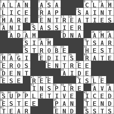 ACROSS 1. Actor Alda or Thicke 5. White ___ sheet 8. Burrowing marine mollusk 12. Louse (plural) 13. Hit sharply and swiftly 14. Virtuous person 15. Female horse 16. Pleas 19. Black tropical American cuckoo 20. More lively and spirited 21. First of billions? 23. Heredity factor (abbr.) 24. Wet nurse (var.) 27. Thailand, formerly 30. Russian ruler of old 31. Disco prop 34. Behest 35. Wise men 38. Prepares for publication 40. Pace 41. Greek god of love 42. Main course 44. Gouge 45. Helper 46. Compass dir. 47. Portuguese money of account (variant) 50. Capri or Wight 53. Stimulate to action 57. Actress Gardner 59. Supplementary 63. On the rocks 64. First name in cosmetics 65. Baking dish 66. Be inclined (to) 67. Separate forcefully 68. Conclusion 69. Fast planes DOWN 1. _ mater 2. Woody, climbing, usually tropical plant 3. Sour-tasting 4. Born 5. Length times width 6. Without 7. Flats, for short 8. Domesticated feline 9. Cards in a Roman deck? 10. One (Scot) 11. Mountains (abbr.) 14. "Two Mules for Sister ____" 17. To free from 18. Car or cant ending 20. Stricken, poetically 22. Help 24. Toward the sea 25. Vertical spar for supporting sails 26. Johnson of "Laugh-In" 28. "We ___ not amused" (Victoria) 29. Method 30. Threesomes 32. Storage container 33. Singer James 35. Ancient Persian 36. Ancient Greek god of war 37. Went 39. Indian title of respect (Mr.) 43. Singer Brickell 47. Cause heat under the collar 48. Compass dir. 49. Eastern Standard Time (abbr.) 51. Shoestrings 52. Incident 54. Corncob 55. _ the terrible 56. Tear apart 58. Sums up 59. Arrange properly for use 60. Purpose 61. Parent Teacher Assoc. 62. For each 63. ___ a Wonderful Life